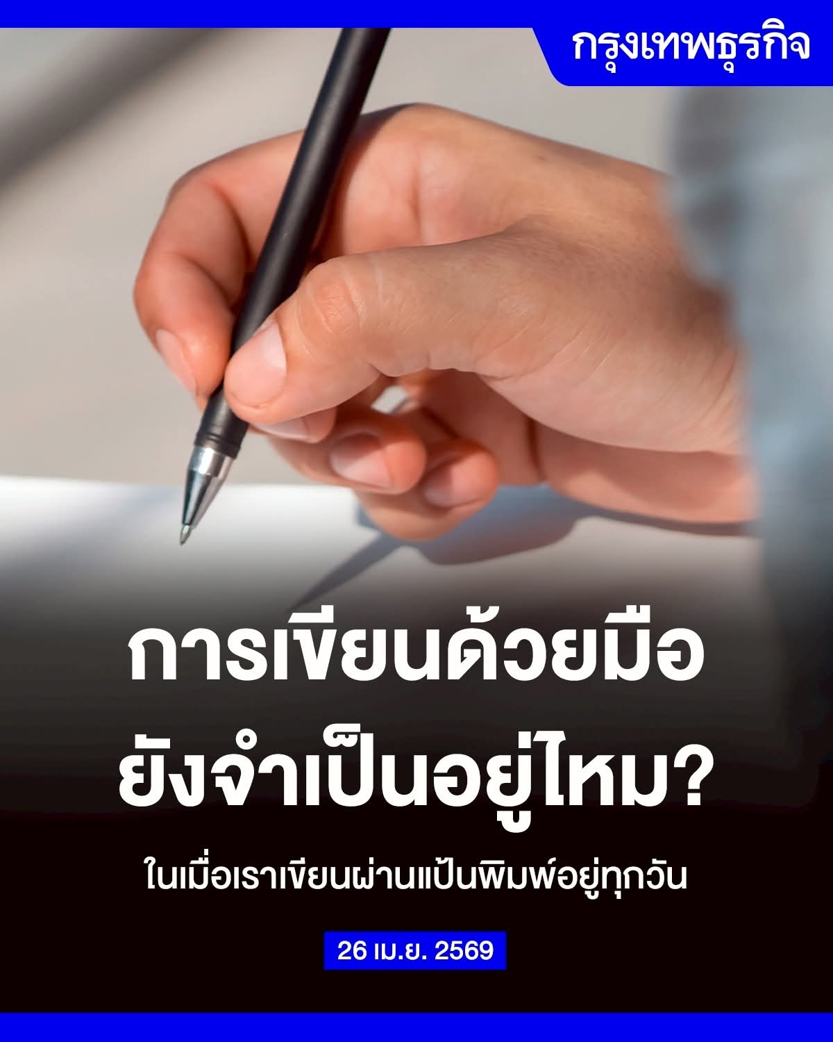 คำถามที่สำคัญมากๆ คือ ในโลกที่ห่างไกลจาก “ดินสอและปากกา” และผู้คนเขียนด้วย “แป้นพิมพ์” เป็นหลักในทุกกระบวนการนี้ในชีวิตประจำวัน เรายังจะมีความจำเป็นแค่ไหนที่จะต้องสอนคนรุ่นใหม่ๆ ให้เขียนด้วยมือ (Handwriting) และ ทักษะการเขียนด้วยมือ ยังจำเป็นในระบบการศึกษายุคดิจิทัลอยู่ไหม?