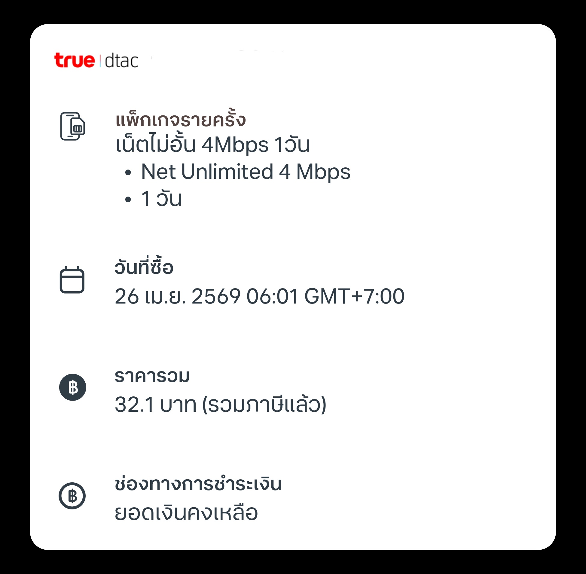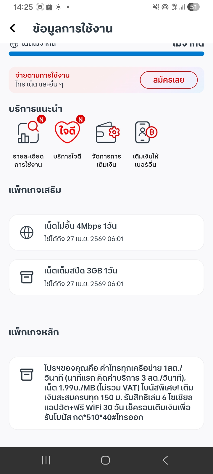 อยากสอบถามว่า ปัจจุบันเราใช้เน็ตรายเดือน 450 บ. แล้วมีกล่องข้อความมาว่าได้รับเน็ตฟรี 1 GB 30 วัน พึ่งรับวันนี้ ใช้ได้ถึง 26 พ.ค.69 อันนี้ถือว่าใช้งานได้เลยใช่ไหมคะ แล้วมันลดสปีดไหมคะ