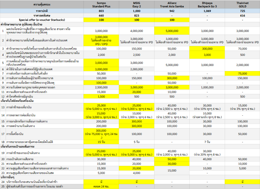 คือเห็นคนเดินทางไปเที่ยวบ่อยๆ แล้วเค้าใช้ heygoody ในการเปรียบเทียบราคาแต่ผมรู้สึกว่าความคุ้มครองมันไม่เท่าพวกเว็บไซต์หลัก ว่างๆ เลยลองทำตารางมาเล่นๆ ดูว่าถ้าซื้อในเว็บไซต์ของแต่ละบริษัทประกันมีอะไรบ้าง