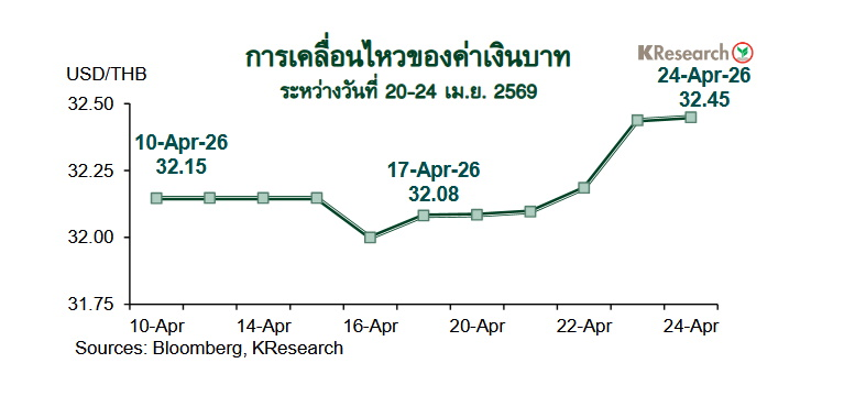 ในวันศุกร์ที่ 24 เม.ย. 2569 เงินบาทแตะระดับอ่อนค่าสุดในรอบ 2 สัปดาห์ที่ 32.51 ก่อนจะปิดตลาดในประเทศที่ 32.45 บาทต่อดอลลาร์ฯ เทียบกับระดับ 32.08 บาทต่อดอลลาร์ฯ ในวันศุกร์ก่อนหน้า (17 เม.ย.)