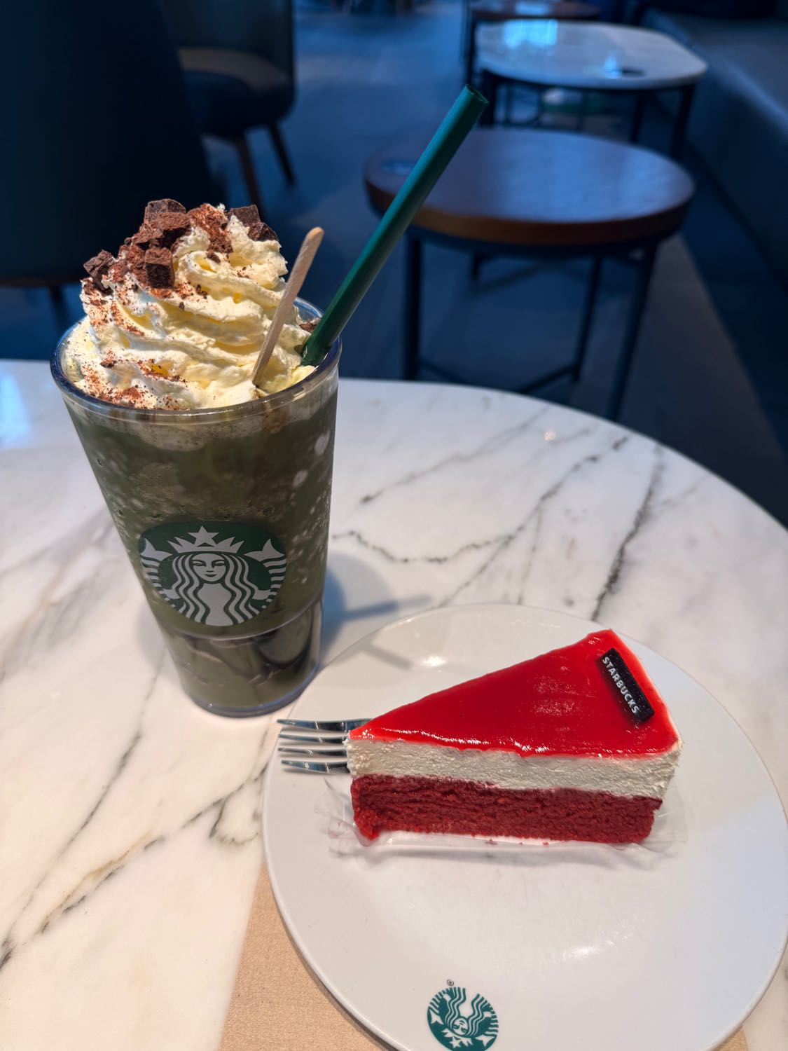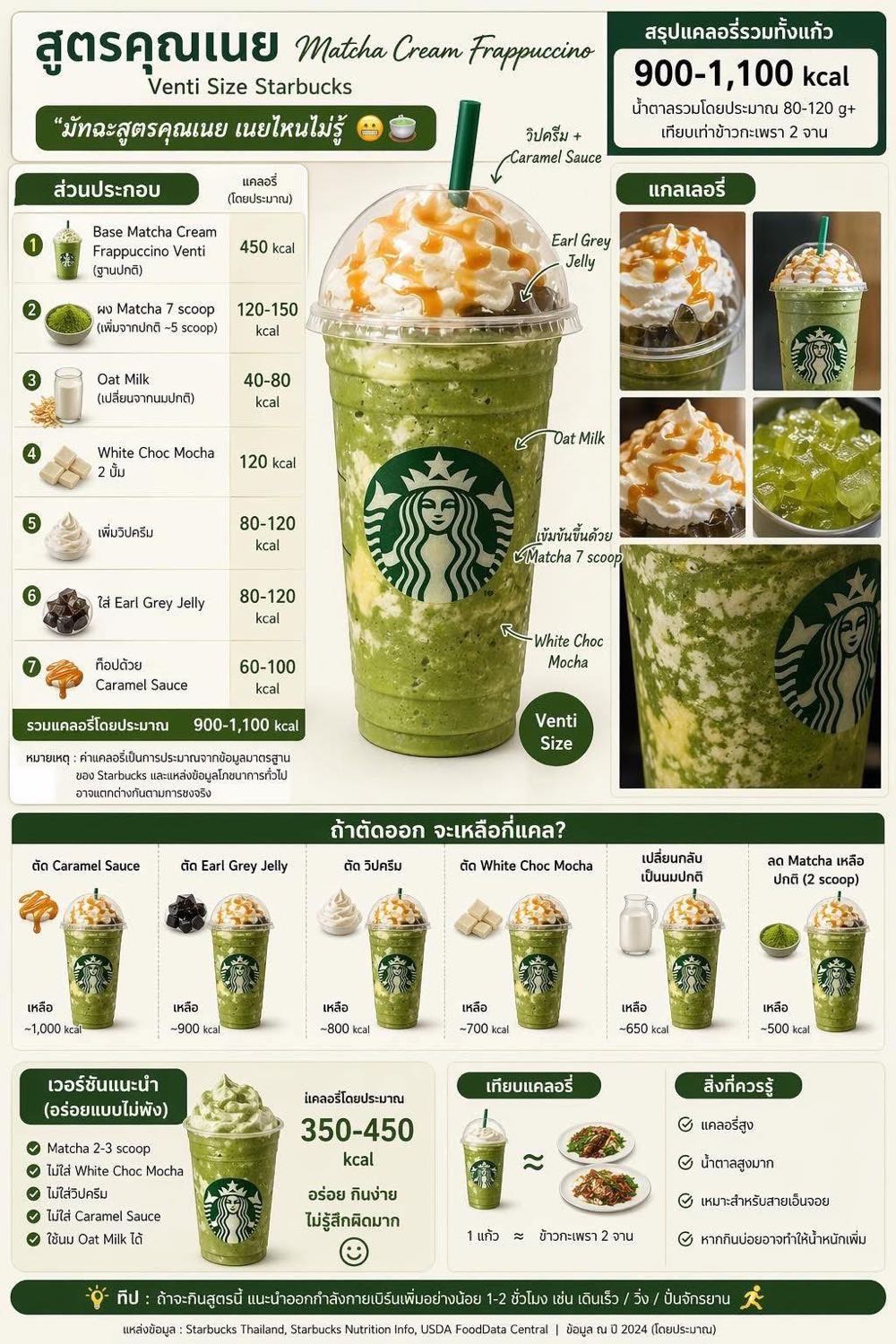 • เวอร์ชันแนะนำ (สูตรสุขภาพขึ้น): ใช้มัทฉะ 2-3 สกู๊ป, ไม่ใส่ไวท์ช็อค, ไม่ใส่วิปครีม, ไม่ใส่คาราเมล จะเหลือเพียง 350 - 450 kcal
