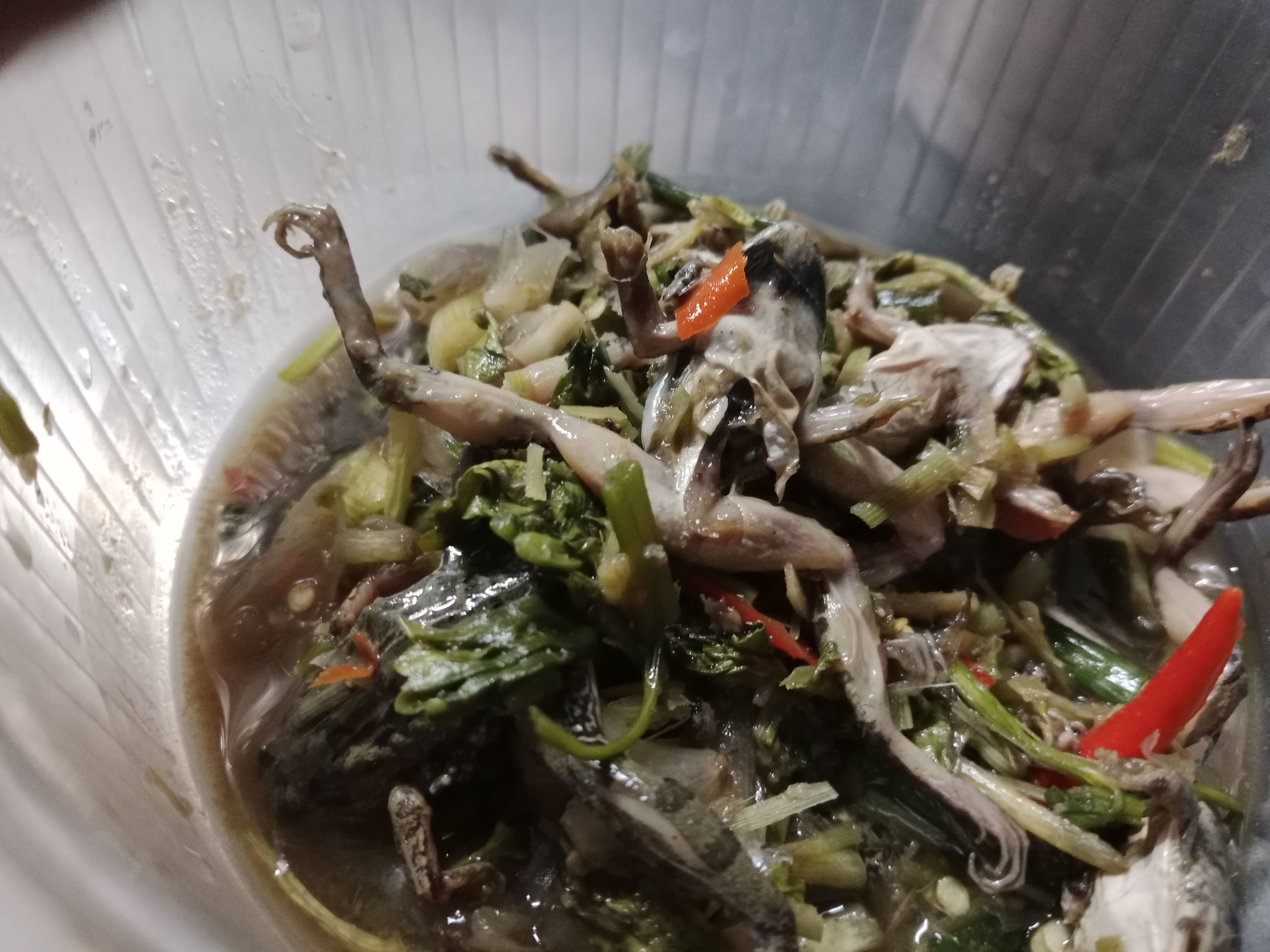 ใส่ผัก: เมื่อเขียดสุกดีแล้ว ใส่ผักกะแยง ผักชีลาว ต้นหอม ลงไปปิดฝาให้ผักสลด