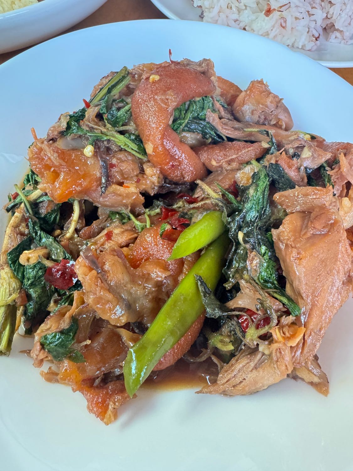 กินข้าวเช้ากัน : กะเพราขาหมู,มะเขือเทศผัดไข่และผักดอก...