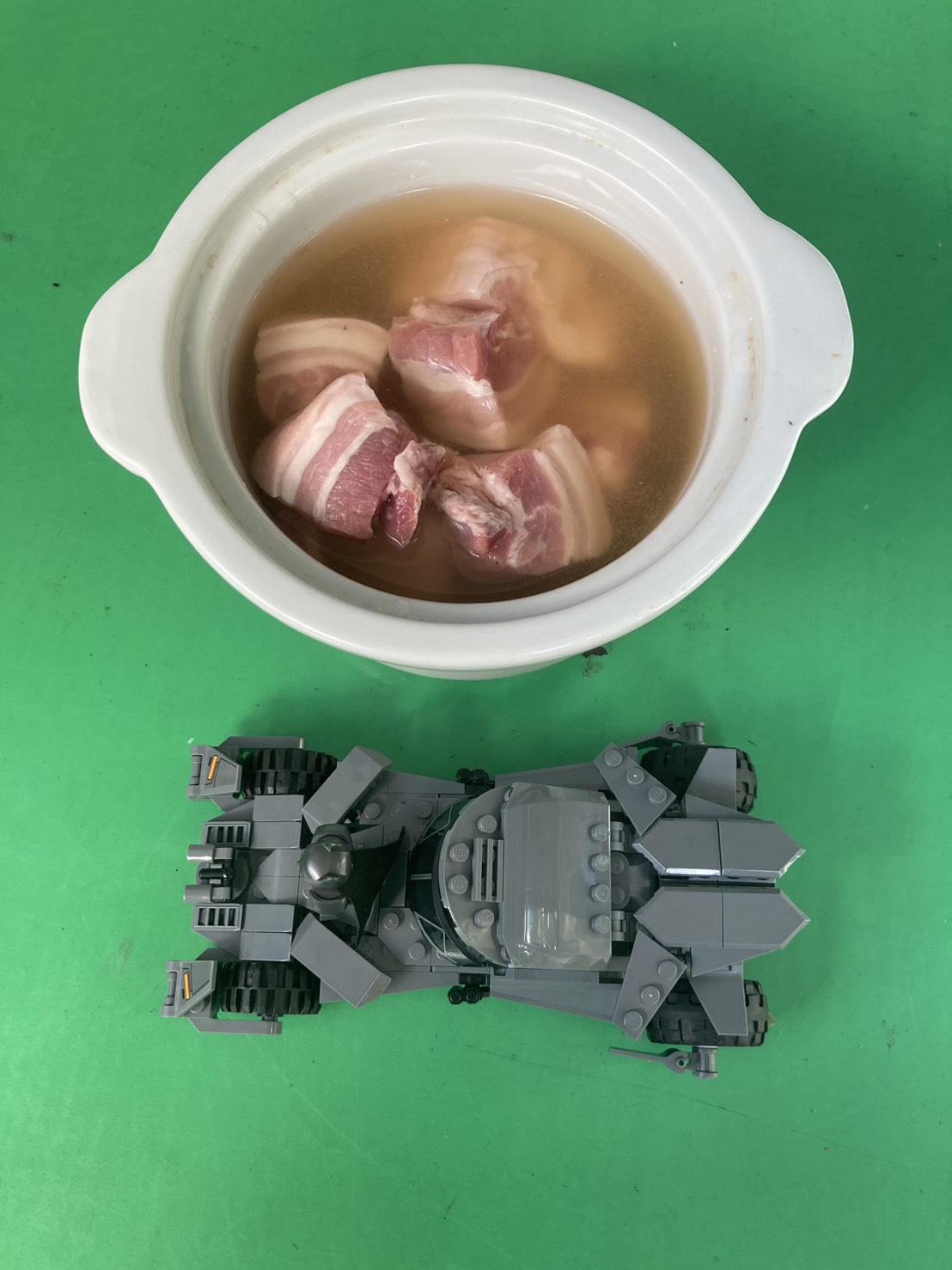แล้วก็นำหมูสามชั้นตามลงไป ยกไปใส่หม้อตุ๋น ถ้าใช้หม้ออัดแรงดันก็ใช้เวลาไม่นาน ขี้เกียจเฝ้าหม้อ เลยจับใส่หม้อตุ๋น