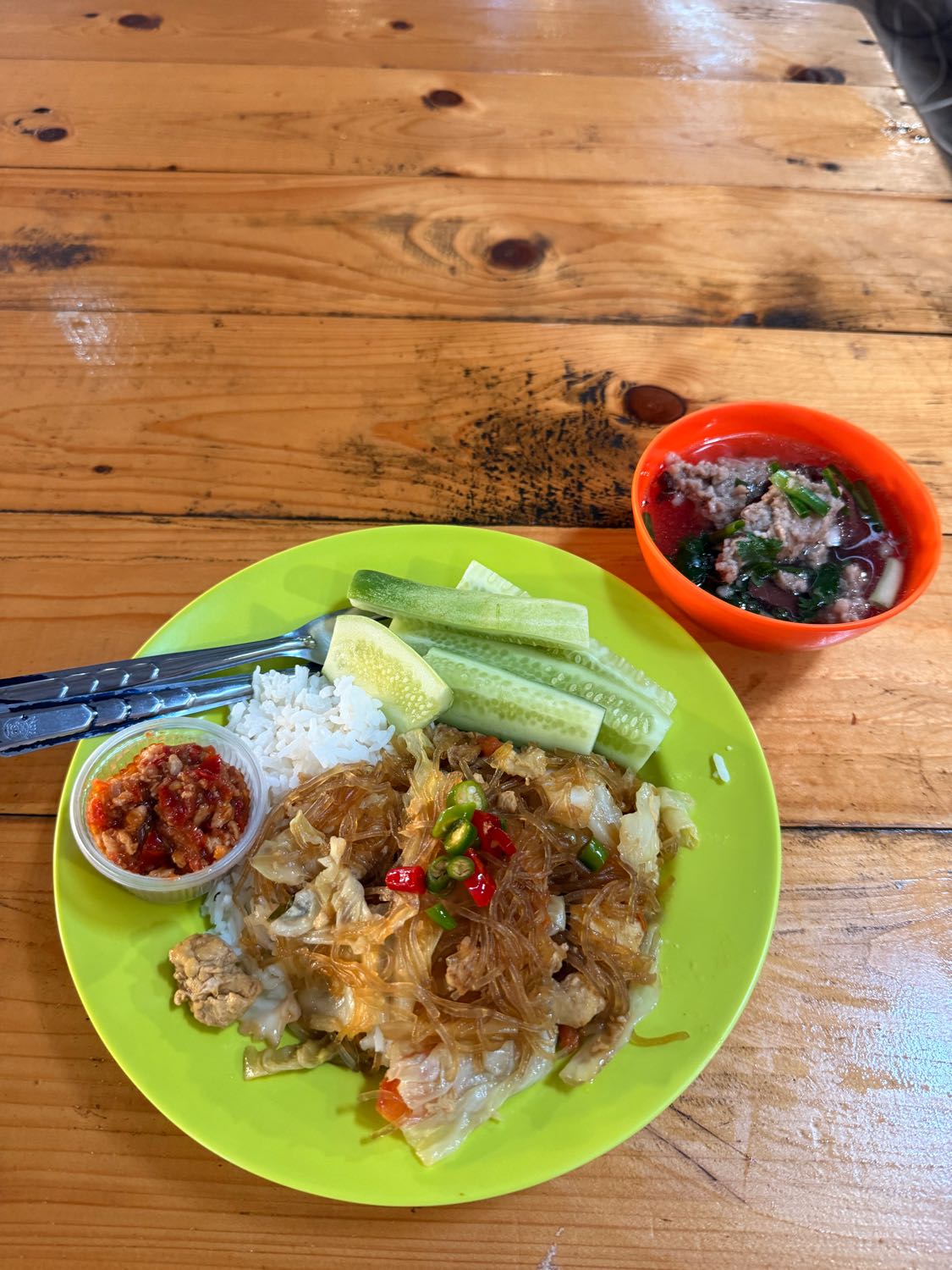 แล้วก็ไปเจอร้านข้าวแกงลุงกับป้า เล็งสักพัก สั่งข้าวราดผัดวุ้นเส้น กับ ต้มเลือดหมู บอกว่าราดน้ำซุปนิดเดียว แต่ปรากฏว่าทางร้านตักใส่ถ้วยเล็กๆมาให้