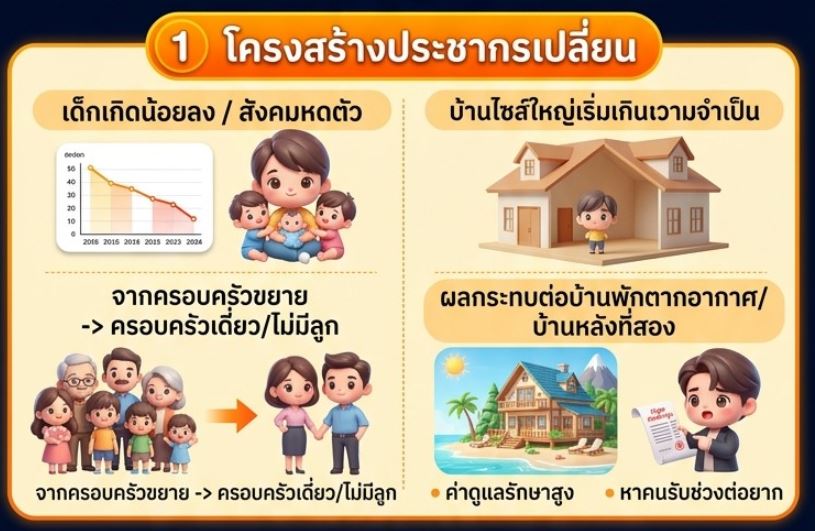 1 ประชากรไทยกำลังลดลง: อย่างที่เรารู้กันว่าเด็กเกิดใหม่น้อยลงมาก สังคมเรากำลังหดตัวลง บ้านไซส์ใหญ่ที่แต่ก่อนออกแบบมาเพื่อรองรับครอบครัวขยาย (ปู่ย่าตายาย พ่อแม่ ลูกหลาน อยู่รวมกัน) เลยอาจจะเริ่มเกินความจำเป็น เพราะเดี๋ยวนี้คนนิยมอยู่เป็นครอบครัวเดี่ยวมากขึ้น หรือหลายคนก็เลือกที่จะไม่มีลูกเลย โดยเฉพาะบ้านหลังที่สองหรือบ้านสำหรับตากอากาศริมทะเล หรือแถบเขาใหญ่ กลุ่มนี้น่าจะได้รับผลกระทบชัดเจนในอนาคต เพราะนอกจากความต้องการซื้อจะลดลงตามจำนวนคนแล้ว การดูแลรักษาบ้านหรือคอนโดริมทะเลหรือในจังหวัดท่องเที่ยวที่ไม่ได้อยู่ประจำก็มีค่าใช้จ่ายสูง อนาคตบ้านกลุ่มนี้น่าจะหาคนมารับช่วงต่อ (Second-hand buyer) ได้ค่อนข้างยาก