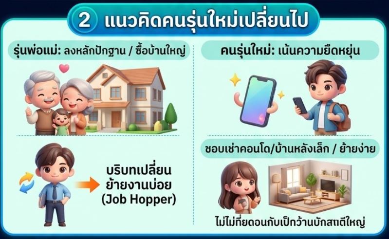 2 Mindset คนรุ่นใหม่เปลี่ยนไป: สมัยก่อนคนรุ่นพ่อแม่เราทำงานที่เดียวจนเกษียณ การซื้อบ้านหลังใหญ่เพื่อลงหลักปักฐานคือเป้าหมายสูงสุด แต่บริบทคนรุ่นใหม่เดี๋ยวนี้เปลี่ยนไปเยอะครับ การย้ายงานบ่อย (Job Hopper) เป็นเรื่องปกติ เน้นความยืดหยุ่นในชีวิตสูง การเช่าคอนโดหรือบ้านไซส์เล็กที่ย้ายทำเลได้ง่าย น่าจะตอบโจทย์ไลฟ์สไตล์มากกว่าการเอาเงินก้อนใหญ่ไปจมกับบ้านที่ผูกมัดให้อยู่กับที่ไปตลอดชีวิต