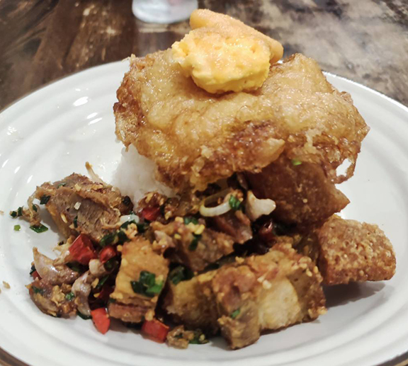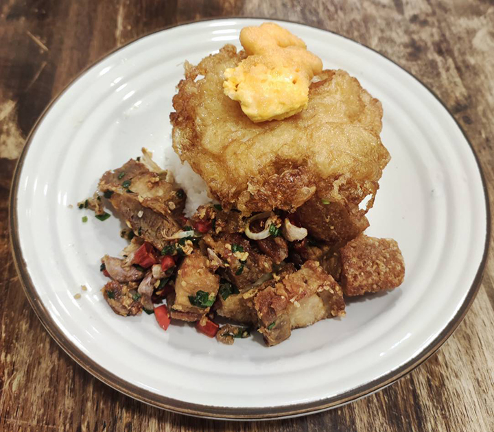 หมูกรอบคั่วพริกเกลือราดข้าวไข่ดาวสุกๆ หมูกรอบทอดสดไม่มัน หนังกรอบมาก พริกเกลือเบาๆ อร่อยมาก