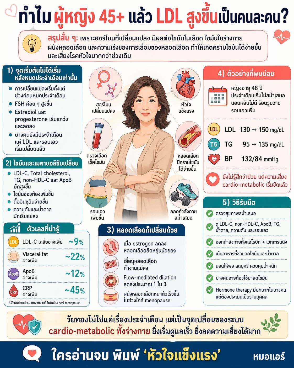 📌สรุปสั้น ๆ คือ วัยทองไม่ใช่แค่เรื่องฮอร์โมนหรือประจำเดือน แต่เป็นช่วงเปลี่ยนสำคัญของระบบ cardio-metabolic ทั้งร่างกาย