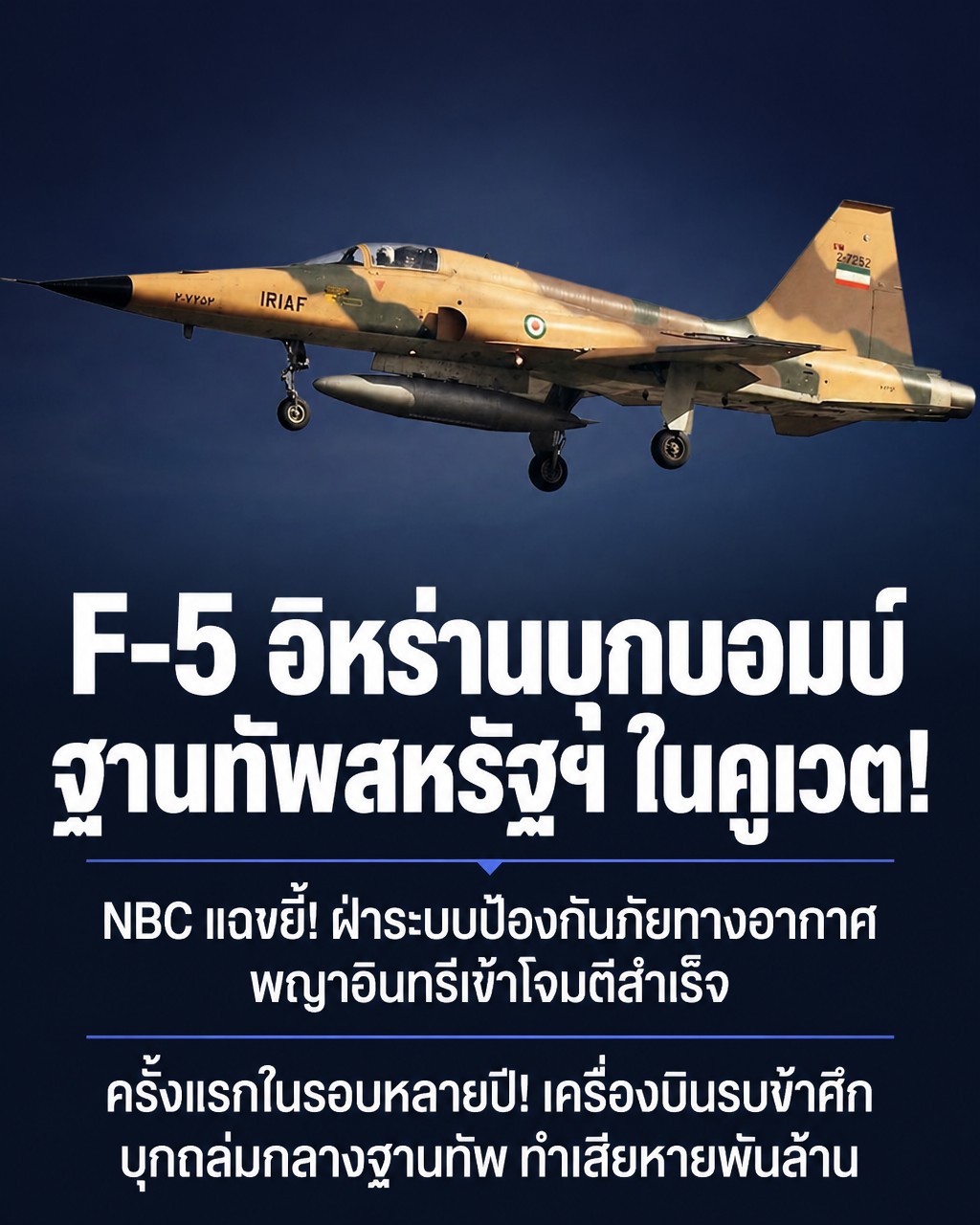 ช็อกโลก! NBC เผย เครื่องบินรบ F-5 รุ่นเก๋าของอิหร่านสร้างประวัติศาสตร์เข้าบอมบ์ฐานทัพสหรัฐฯ ในคูเวตสำเร็จ
