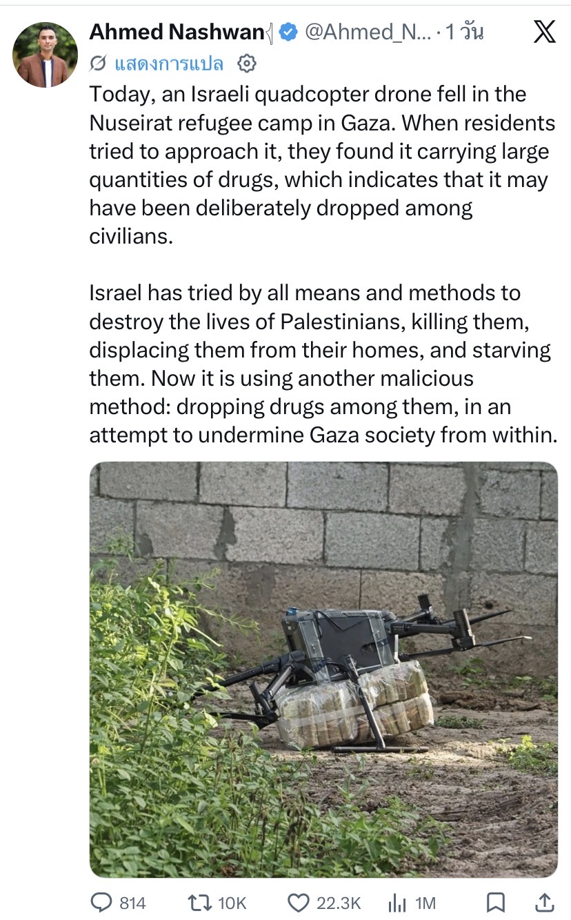 อิสราเอลส่งโดรนทิ้งยาเสพติดใส่ร้ายประชาชนพลเรือนก่อนโจมตีทำลาย ยุทธศาสตร์เดียวกับการรุกรานทำลายอิหร่าน