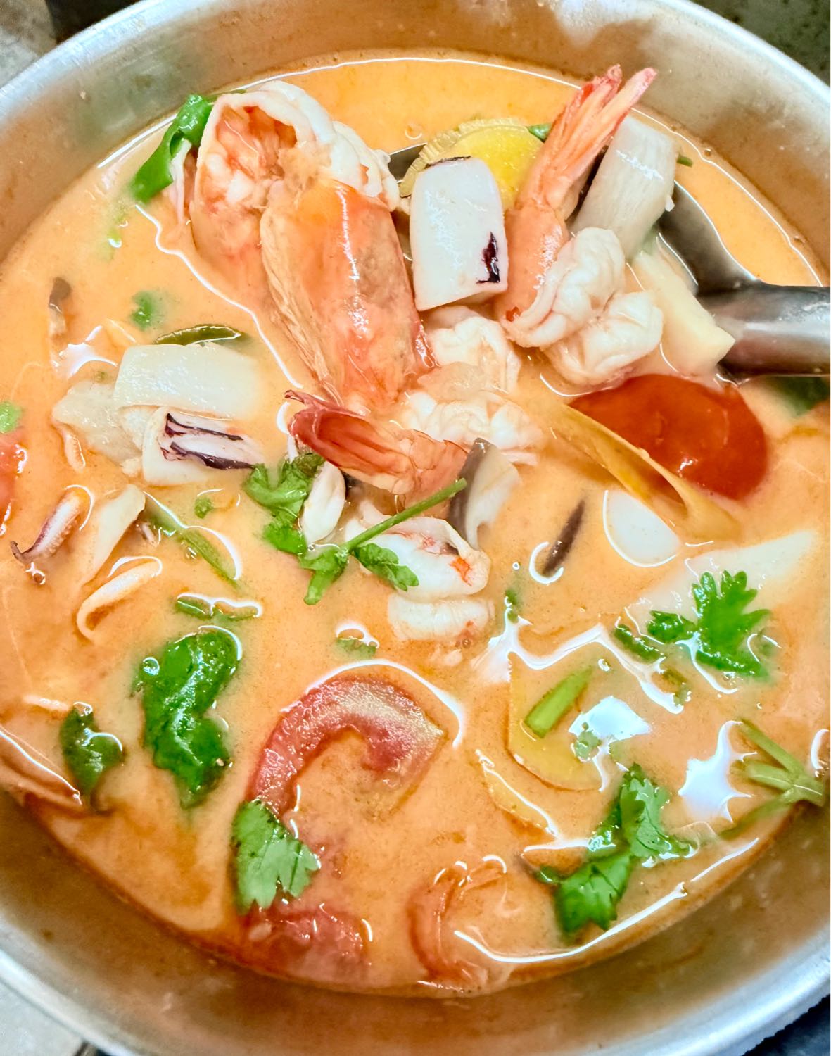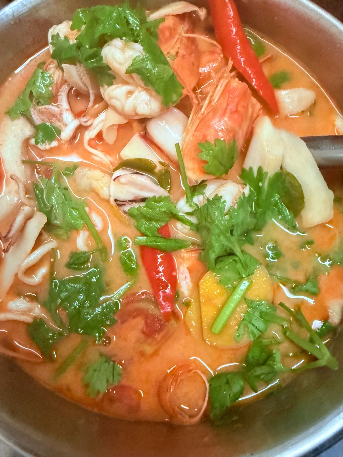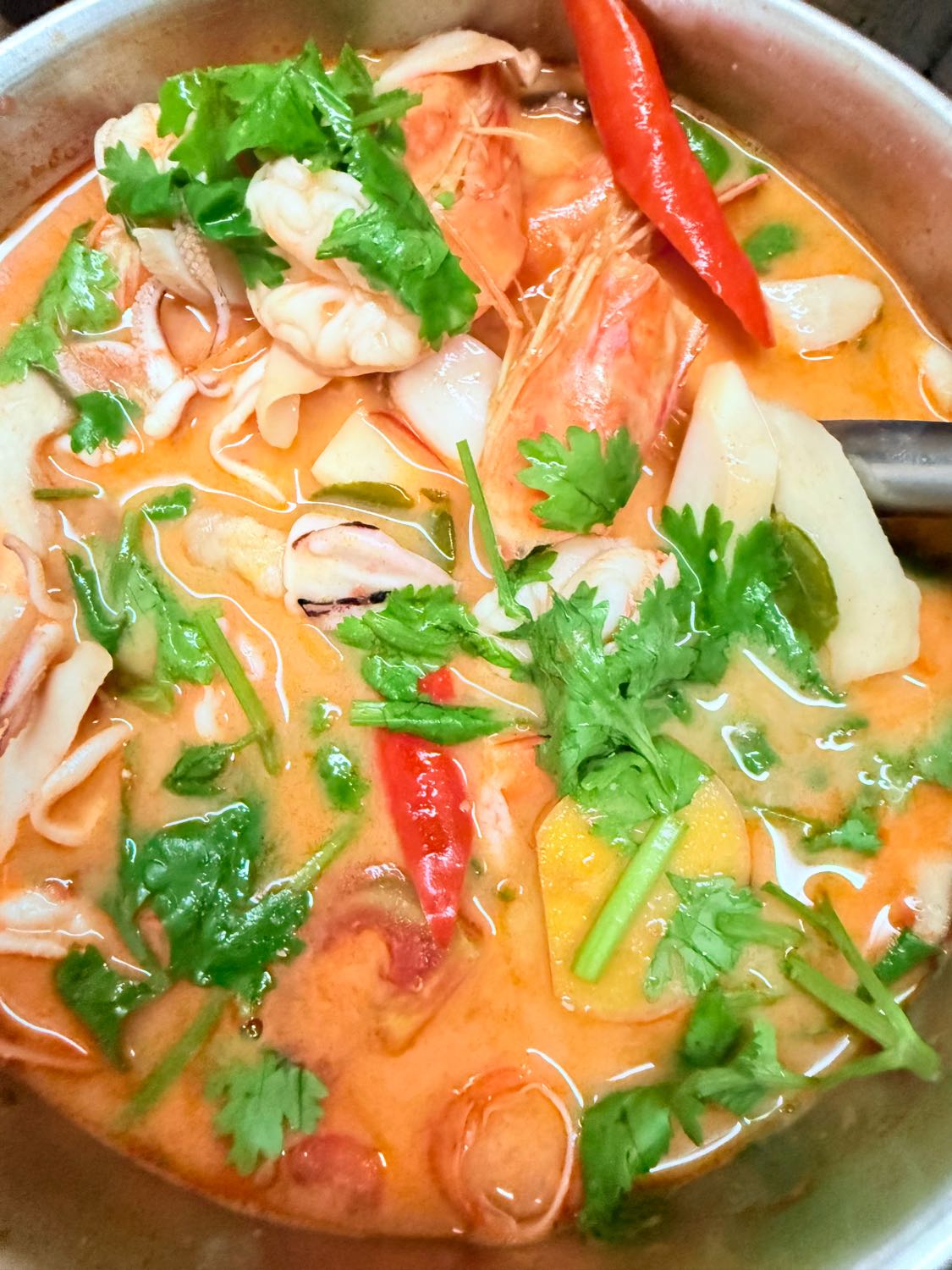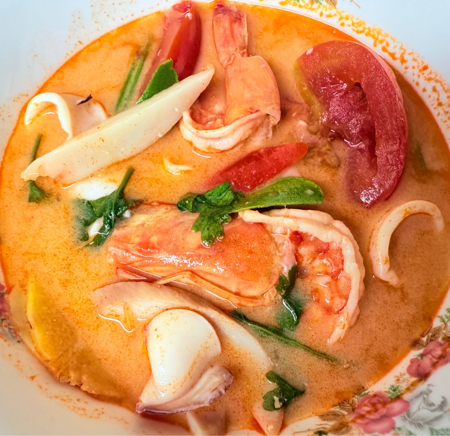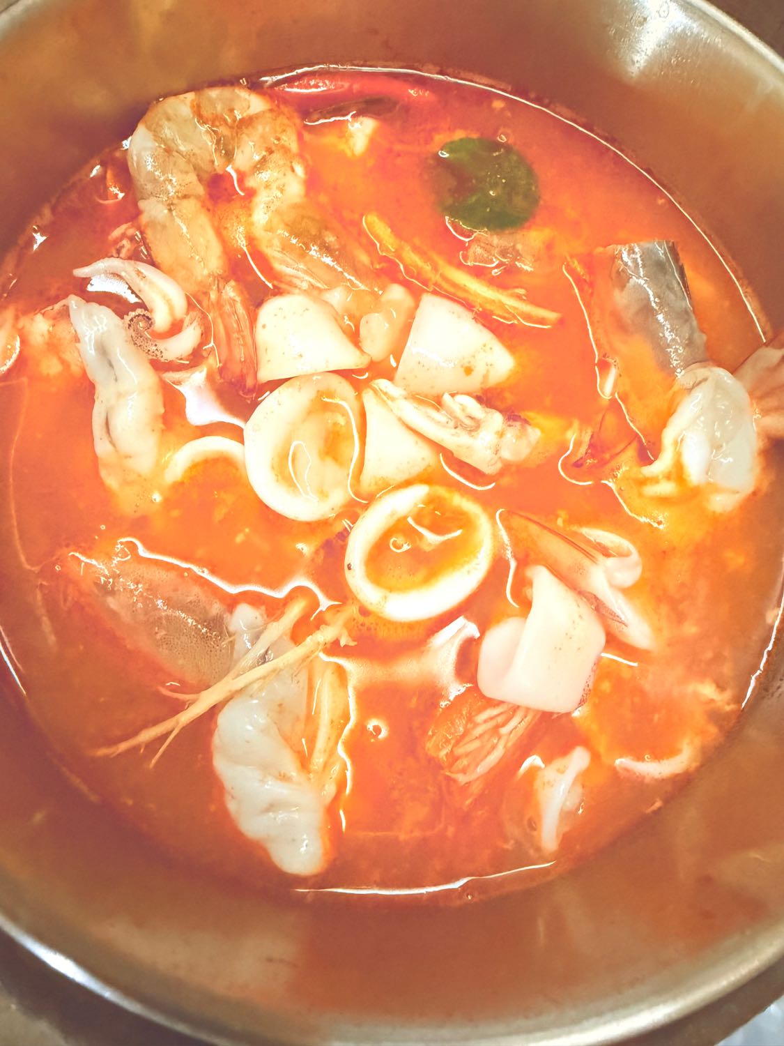 ใส่ปลาหมึกด้วย ครบเครื่องพริก,ข่า,ตะไคร้,ใบมะกรูด ปรุงแต่งรสชาติตามชอบแล้วแต่จะชอบต้มยำน้ำใสหรือต้มยำน้ำข้นส่วนตัวชอบทั้ง2ครับ รสชาติอร่อยสะกิดลิ้นดีเลยครับสมาชิก ทำกินเองก็ต้องอร่อยอยู่แล้ว เก็บสะสมรสชาติข้อมูลมาหลายร้านมาหลายพื้นที่วันนี้มาลองทำกินเองดูบ้าง อร่อยดีครับ