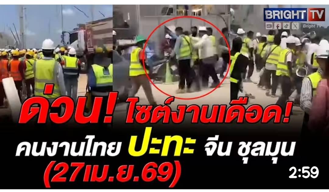 ภาพเหตุการณ์ชุลมุนตะลุมบอนกันในไซต์งานก่อสร้าง ในตำบลมาบข่า อำเภอนิคมพัฒนา จังหวัดระยอง กลุ่มแรงงานชาวไทยและชาวจีน มีปากเสียงกัน ก่อนลุกลามบานปลาย ชกต่อย ทำร้ายร่างกายกัน และมีเสียงแตรจากรถบรรทุกดังขึ้นมา เพื่อระงับเหตุ