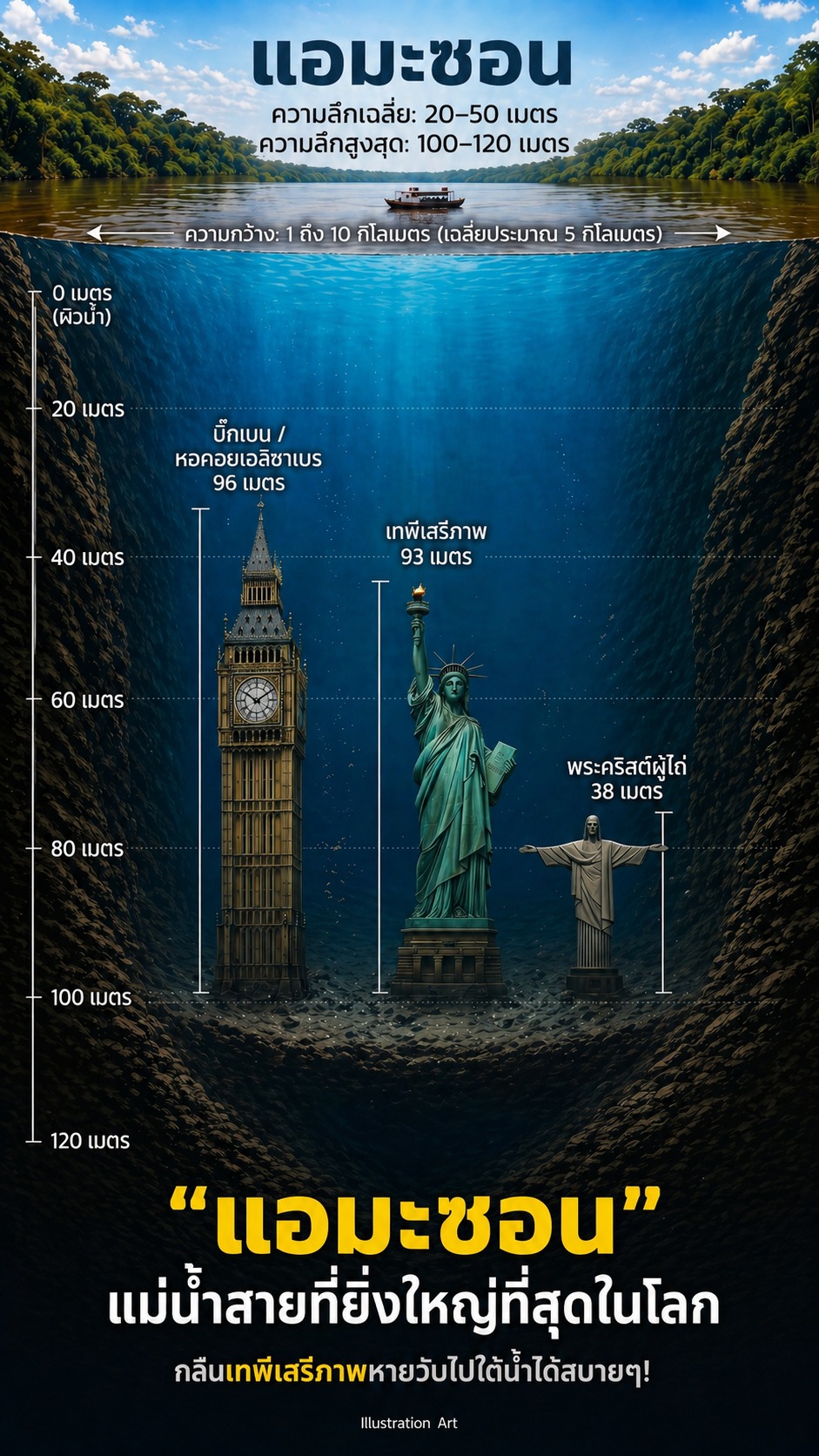 ส่วนความลึกนั้นก็ลึกมากจนเราสามารถนำเอาตึกสูงๆ หรืออนุสาวรีย์ระดับโลกไปวางไว้ใต้น้ำได้อย่างสบายๆ เพราะในจุดที่ลึกที่สุดอย่างบริเวณเมืองโอบีโดส (Óbidos) ประเทศบราซิล แม่น้ำแอมะซอนมีความลึกทะลุ 100 เมตร ไปแล้ว ซึ่งลึกพอที่จะจมมิดหอนาฬิกาบิ๊กเบน (Big Ben) ที่สูง 96 เมตร เทพีเสรีภาพ (Statue of Liberty) ที่สูง 93 เมตร รวมถึงรูปปั้นพระคริสต์ผู้ไถ่ (Christ the Redeemer) ที่มีความสูง 38 เมตร ได้ได้สบายๆเลย โดยไม่มีส่วนใดโผล่พ้นผิวน้ำขึ้นมา