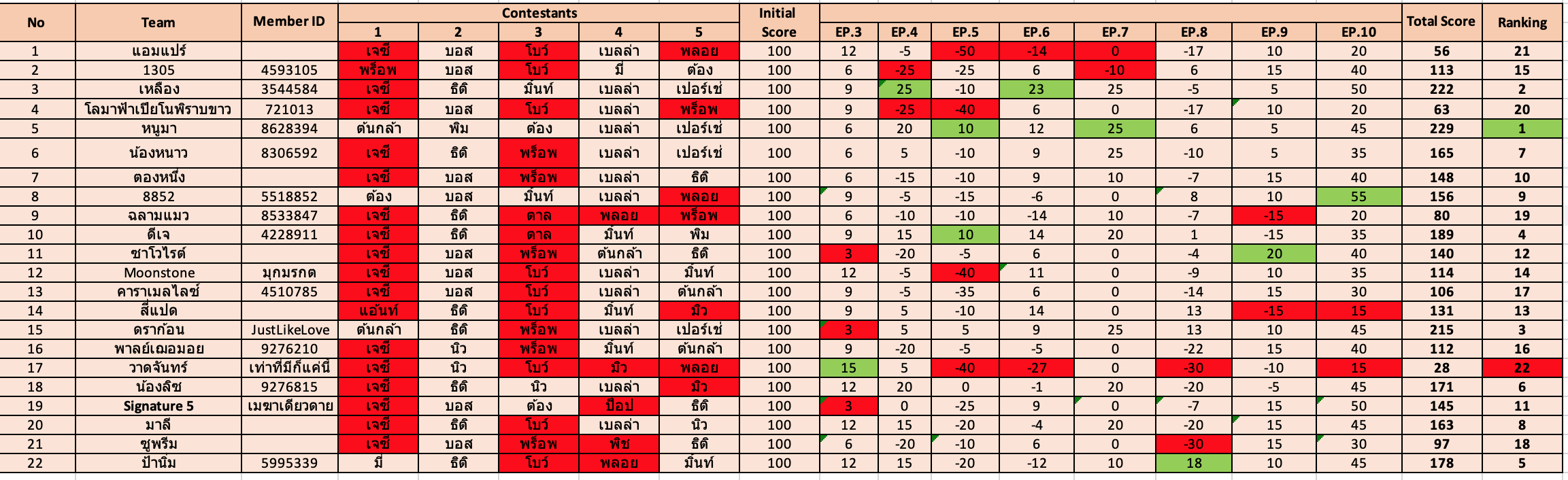 ทีมอันดับหนึ่งไม่สั่นคลอนเลยคือเมนเทอร์หนูมา ไม่โดนตัดทีมเดียวสวยๆ ยังครบห้าคน คะแนนรวมสูงสุด แต่วีคนี้ลูกทีมทำผลงานได้ทั้งดีและแย่ แต่คะแนนรายวีคไม่ติดลบน้าาา เพราะวีคนี้มีคะแนนสำหรับท็อป10 รวมไว้ ฮ่าๆ