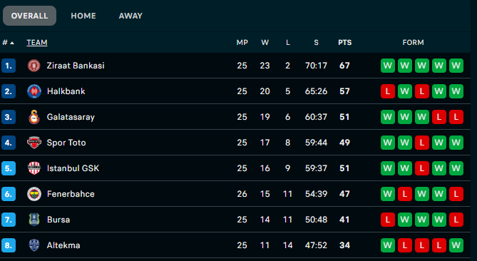 ในฤดูกาล 2025 / 2026 หนุ่มธนาคาร Ziraat ชนะ 23 นัด แพ้ 2 นัด