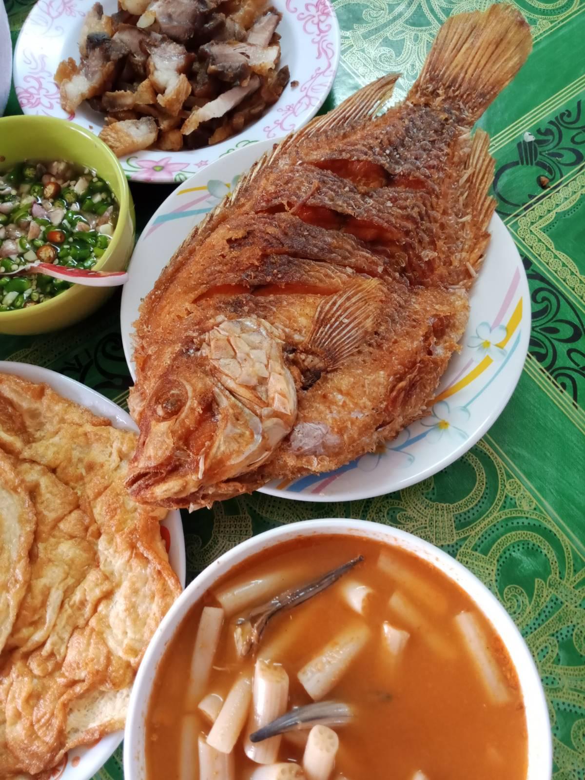 แกงส้มปลาทอด ฝีมือแม่ผมเอง ปลาทอดหอม ๆ ในน้ำแกงส้ม คืออร่อยแท้ ผัดหมูพริก 3 สี ไม่ได้ใส่หอมใหญ่เพราะเจ๊ผมไม่กิน แกขี้เกียจเขี่ย กลัว Food waste เลยบอกแม่ไว้ พริ