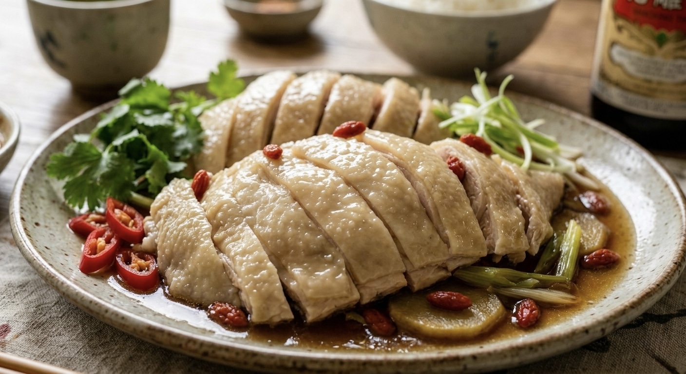 อาม่าจะใช้เนื้อไก่ส่วนน่องติดสะโพก นำไปล้างให้สะอาด ซับให้แห้ง ทาเกลือบางๆ ทิ้งไว้ 15 นาที ระหว่างรอ ตั้งหม้อต้มน้ำ ใส่ขิงบุบและต้นหอมลงไป พอน้ำเดือดให้หรี่ไฟลง ห้ามน้ำเดือดพล่านเด็ดขาด