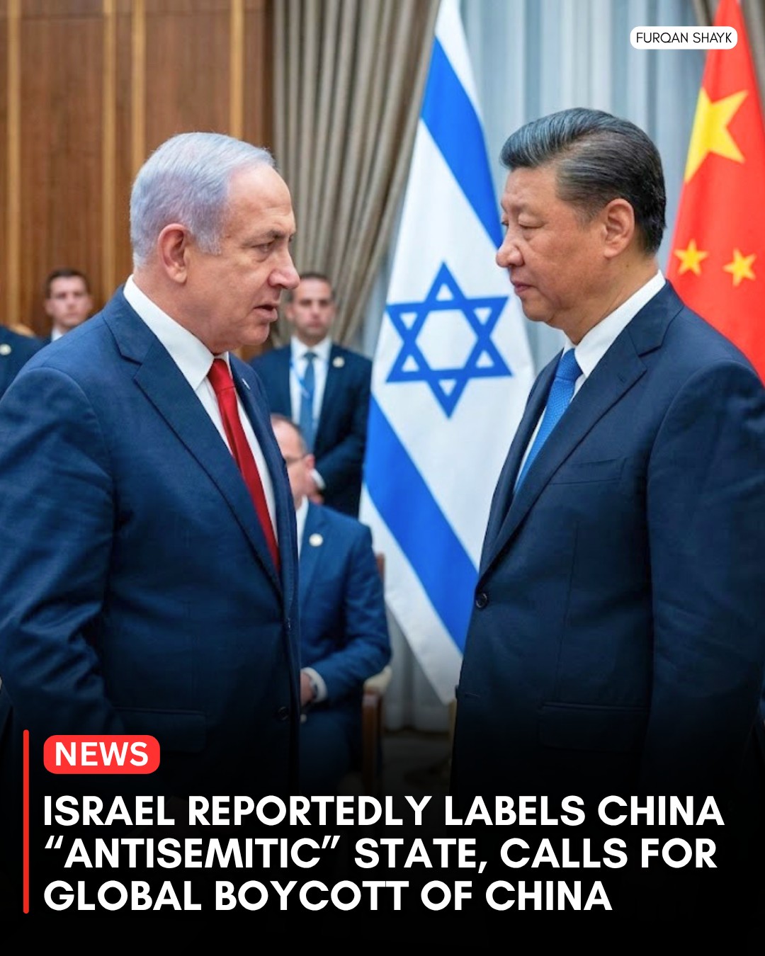 ความสัมพันธ์ทางการทูตระหว่างอิสราเอลและจีนตกต่ำอย่างที่ไม่เคยปรากฏมาก่อน หลังจากมีรายงานว่ารัฐบาลอิสราเอลได้ประกาศอย่างเป็นทางการว่าจีนเป็น "รัฐต่อต้านยิว" การกระทำที่ไม่เคยเกิดขึ้นมาก่อนนี้เกิดขึ้นหลังจากสงครามคารมที่ทวีความรุนแรงขึ้นเกี่ยวกับการที่จีนปฏิเสธที่จะประณามการโจมตีอิสราเอลในภูมิภาค และบทบาทที่ถูกกล่าวหาว่าปล่อยให้ "คลื่นแห่งวาทกรรมต่อต้านยิว" แพร่กระจายไปทั่วแพลตฟอร์มดิจิทัลที่รัฐควบคุม การเรียกร้องให้คว่ำบาตรสินค้าและบริการของจีนทั่วโลกนั้น อิสราเอลได้แสดงออกถึงการต่อต้านรัฐบาลจีน
