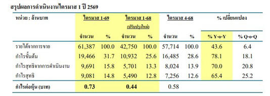 ทั้งนี้ในส่วนของ ยอดขายสินค้าและบริการในไตรมาสนี้อยู่ที่ 61,387ล้านบาท เพิ่มขึ้นสูงถึงร้อยละ 43.6 จากไตรมาสเดียวกันของปีก่อน และปรับตัวดีขึ้นร้อยละ 6.4 จากไตรมาสที่แล้ว สะท้อนการเริ่มต้น ปีงบประมาณ 2569 อย่างแข็งแกร่ง บนแนวโน้มรายได้ขาขึ้นต่อเนื่องจากปี 2568 ซึ่งไดร้ับแรงหนุนจากการเติบโตของคำสั่งซื้อใหม่การเพิ่มขึ้นของผลผลิตโรงงาน และการขยายกำลังการผลิต