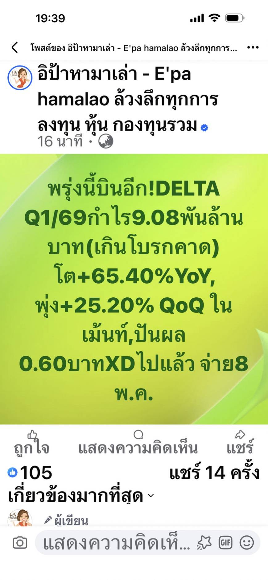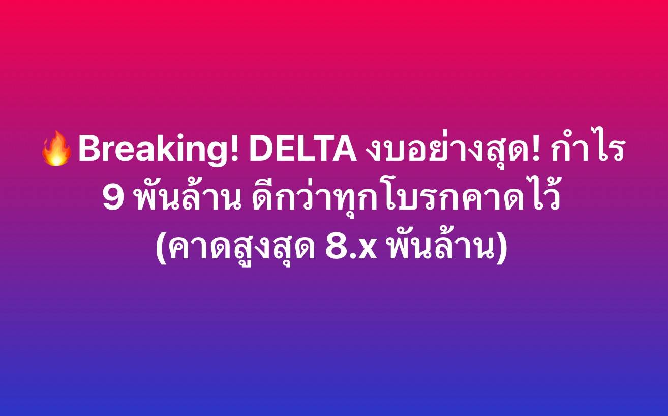 บริษัทเดลต้า อีเลคโทรนิคส์ (ประเทศไทย) จำกัด (มหาชน) หรือ DELTA แจ้งผลประกอบการไตรมาส 1/259 ต่อตลาดหลักทรัพย์แห่งประเทศไทยว่า กำไรจากการดำเนินงานในไตรมาสนี้มีจำนวน 9,691 ล้านบาท คิดเป็นอัตรากำไรร้อยละ