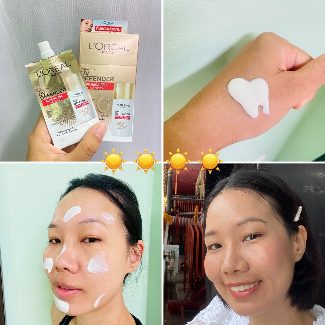 เราชอบตัวนี้มากกกกค่ะ กลับมาตายรังตลอดเลย คือเนื้อเค้าดีจริงๆ นุ่ม ลื่น เหมือนใช้สกินแคร์ เราใช้แล้วไม่ระคายเคือง ไม่กวนเมคอัพ เติมทับเมคอัพได้ ใช้แล้วผิวดูดี ลูกรักเลยค่ะ ... ส่วนประสิทธิภาพการกันแดด หน้าไม่หมองคล้ำไม่เยิ้มเลย แม้จะทาเช้าถึงค่ำ (ซองละ 25 บาท)