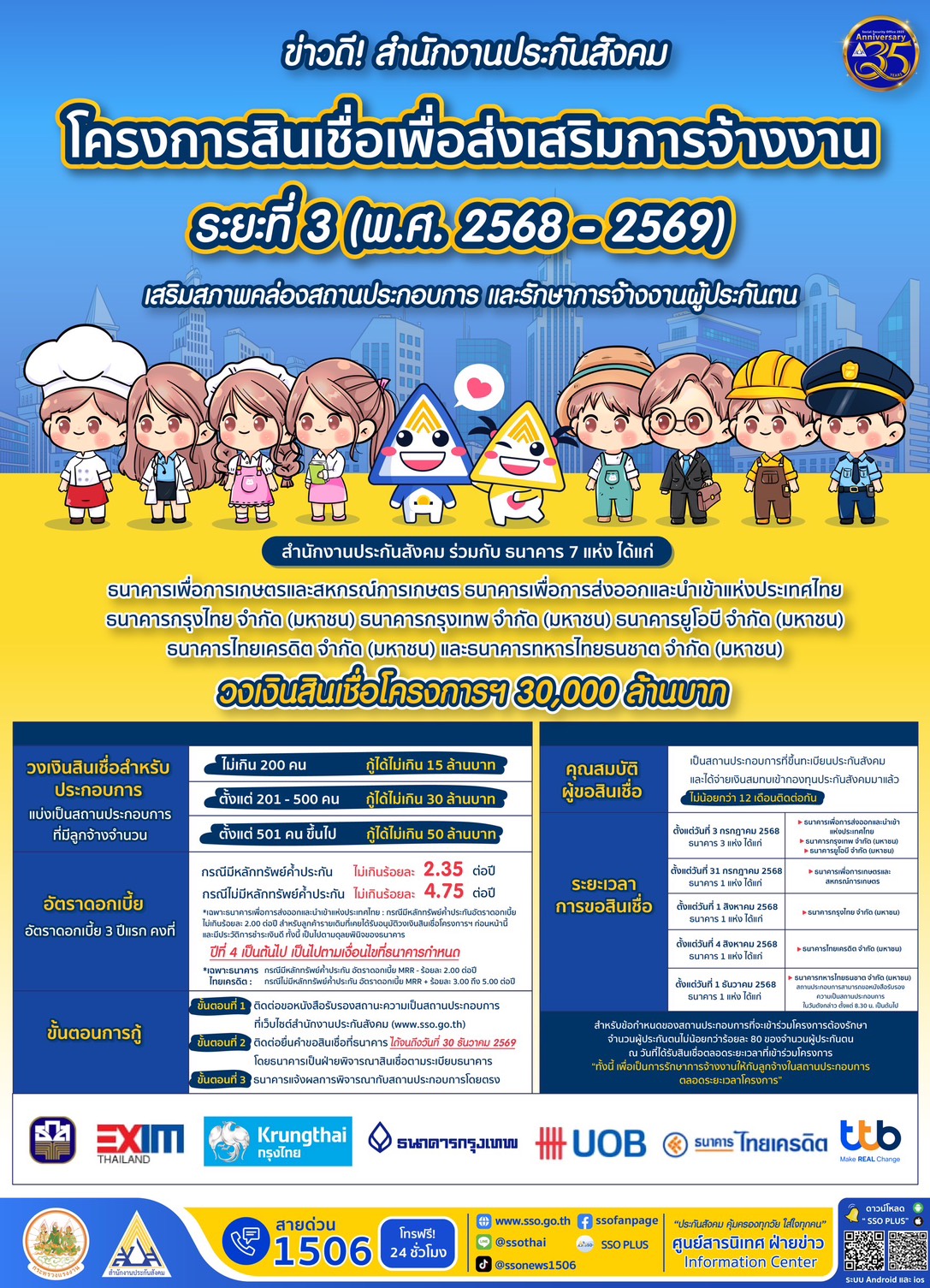 ในด้านการเสริมสภาพคล่องแก่ภาคธุรกิจ สำนักงานประกันสังคมได้ร่วมกับธนาคารพันธมิตร 7 แห่ง ได้แก่ ธนาคารเพื่อการเกษตรและสหกรณ์การเกษตร, ธนาคารกรุงเทพ จำกัด (มหาชน) ,ธนาคารเพื่อการส่งออกและนำเข้าแห่งประเทศไทย, ธนาคารกรุงไทย จำกัด (มหาชน), ธนาคารยูโอบี จำกัด (มหาชน), ธนาคารไทยเครดิต จำกัด (มหาชน) และธนาคารทหารไทยธนชาต จำกัด (มหาชน) จัดสรรวงเงินรวม 30,000 ล้านบาท เพื่อสนับสนุนสินเชื่อแก่สถานประกอบการให้มีสภาพคล่องทางธุรกิจและสามารถรักษาระดับการจ้างงาน โดยกำหนดวงเงินกู้ตั้งแต่ไม่เกิน 15 ล้านบาท ไปจนถึง 50 ล้านบาทตามขนาดกิจการ อัตราดอกเบี้ยคงที่ในช่วง 3 ปีแรก ไม่เกินร้อยละ 2.35 ต่อปี (กรณีมีหลักทรัพย์ค้ำประกัน) และไม่เกินร้อยละ 4.75 ต่อปี (กรณีไม่มีหลักทรัพย์ค้ำประกัน) สำหรับปีที่ 4 เป็นต้นไป อัตราดอกเบี้ยเป็นไปตามที่ธนาคารแต่ละแห่งกำหนด ทั้งนี้ ผู้ประกอบการที่เข้าร่วมโครงการต้องส่งเงินสมทบประกันสังคมต่อเนื่องไม่น้อยกว่า 12 เดือน และต้องรักษาการจ้างงานไม่น้อยกว่าร้อยละ 80 โดยเปิดให้ยื่นขอสินเชื่อได้ตั้งแต่วันที่ 3 กรกฎาคม 2568 ถึงวันที่ 30 ธันวาคม 2569 หรือจนกว่าจะครบวงเงินโครงการ (อย่างใดอย่างหนึ่งถึงก่อน) ผ่านการขอหนังสือรับรองสถานะความเป็นสถานประกอบการจากเว็บไซต์สำนักงานประกันสังคม www.sso.go.th ก่อนติดต่อธนาคารที่เข้าร่วมโครงการ ซึ่งธนาคารเป็นผู้พิจารณาอนุมัติตามหลักเกณฑ์ของธนาคาร โดยปัจจุบันมีสถานประกอบการที่ได้รับอนุมัติสินเชื่อแล้วจำนวน 1,071 แห่ง สามารถรักษาการจ้างงานของลูกจ้างจำนวน 137,986 ราย คิดเป็นวงเงินรวม 11,347.52 ล้านบาท