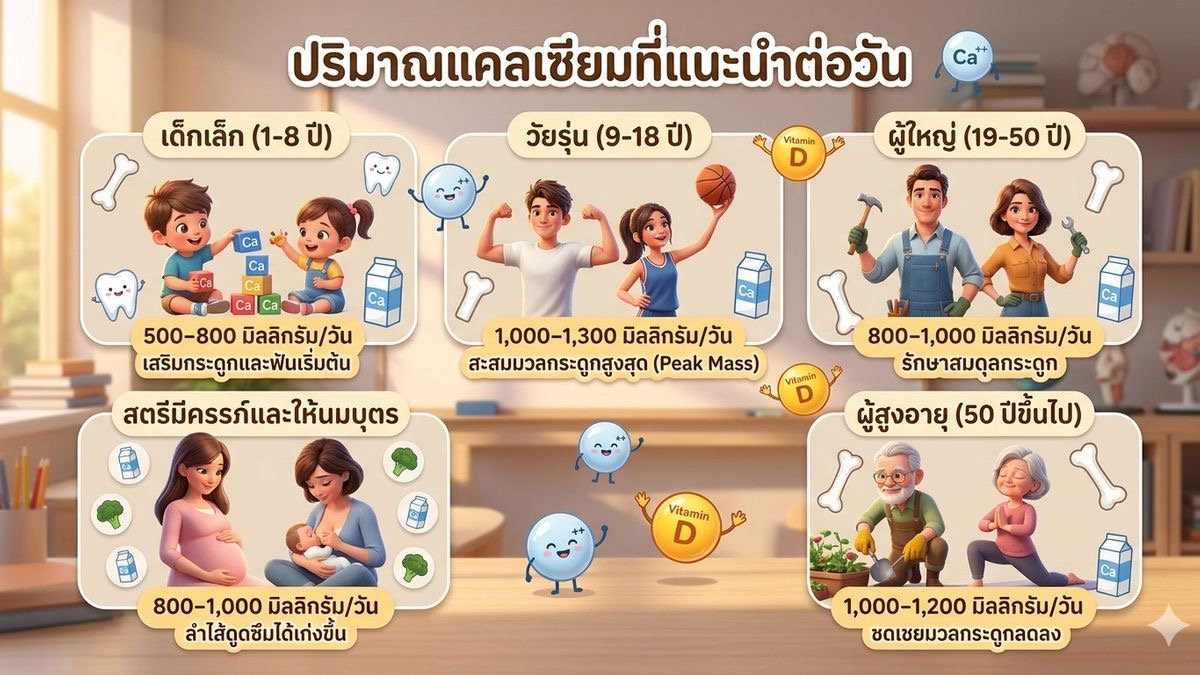 • สตรีมีครรภ์และให้นมบุตร: ต้องการแคลเซียม 800 - 1,000 มิลลิกรัมต่อวัน ในช่วงนี้ร่างกายจะปรับตัวทางสรีรวิทยาให้ลำไส้ดูดซึมแคลเซียมได้เก่งขึ้นตามธรรมชาติ ปริมาณที่ต้องการจึงเทียบเท่ากับวัยผู้ใหญ่ปกติ แต่เน้นย้ำว่าต้องทานให้ครบอย่างสม่ำเสมอ
