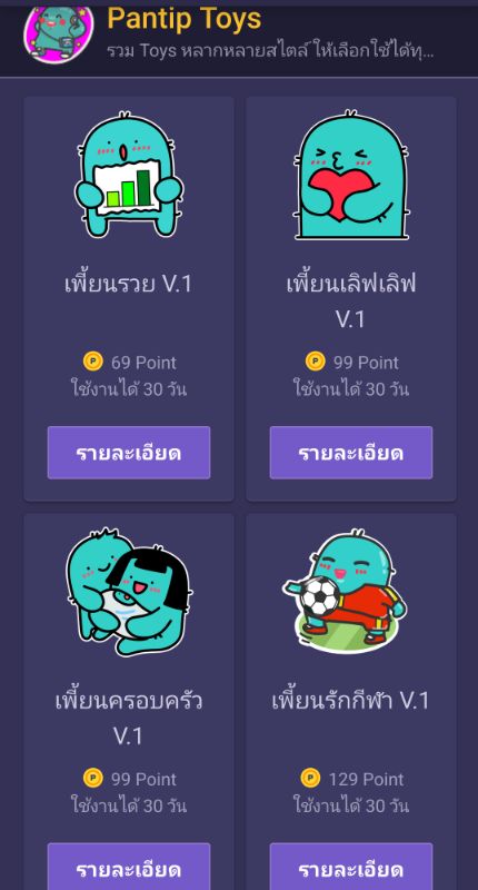 ดีใจมากเลยที่ทางพันทิปทำ pantip toys ใหม่ ๆ มาให้ใช้เสียที😻 แต่ pantip toys แต่ละชุดก็ใช้แต้มในการแลกไม่เท่ากันนะครับ และใช้ได้แค่30วัน(แต่แลกใหม่ได้เรื่อย ๆ)