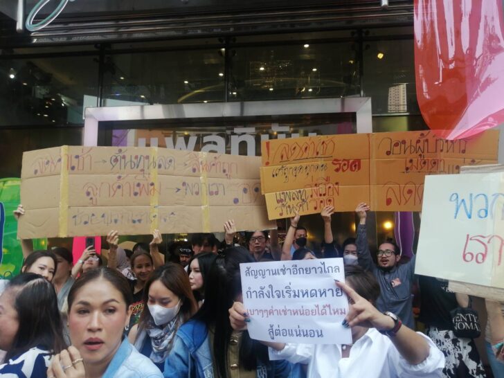 ขณะที่ผู้ชุมนุมรายหนึ่งถือป้ายระบุว่า “สัญญาเช่าอีกยาวไกล กำลังใจเริ่มหมดหาย เบา ๆ ค่าเช่าหน่อยได้ไหม สู้ต่อแน่นอน”