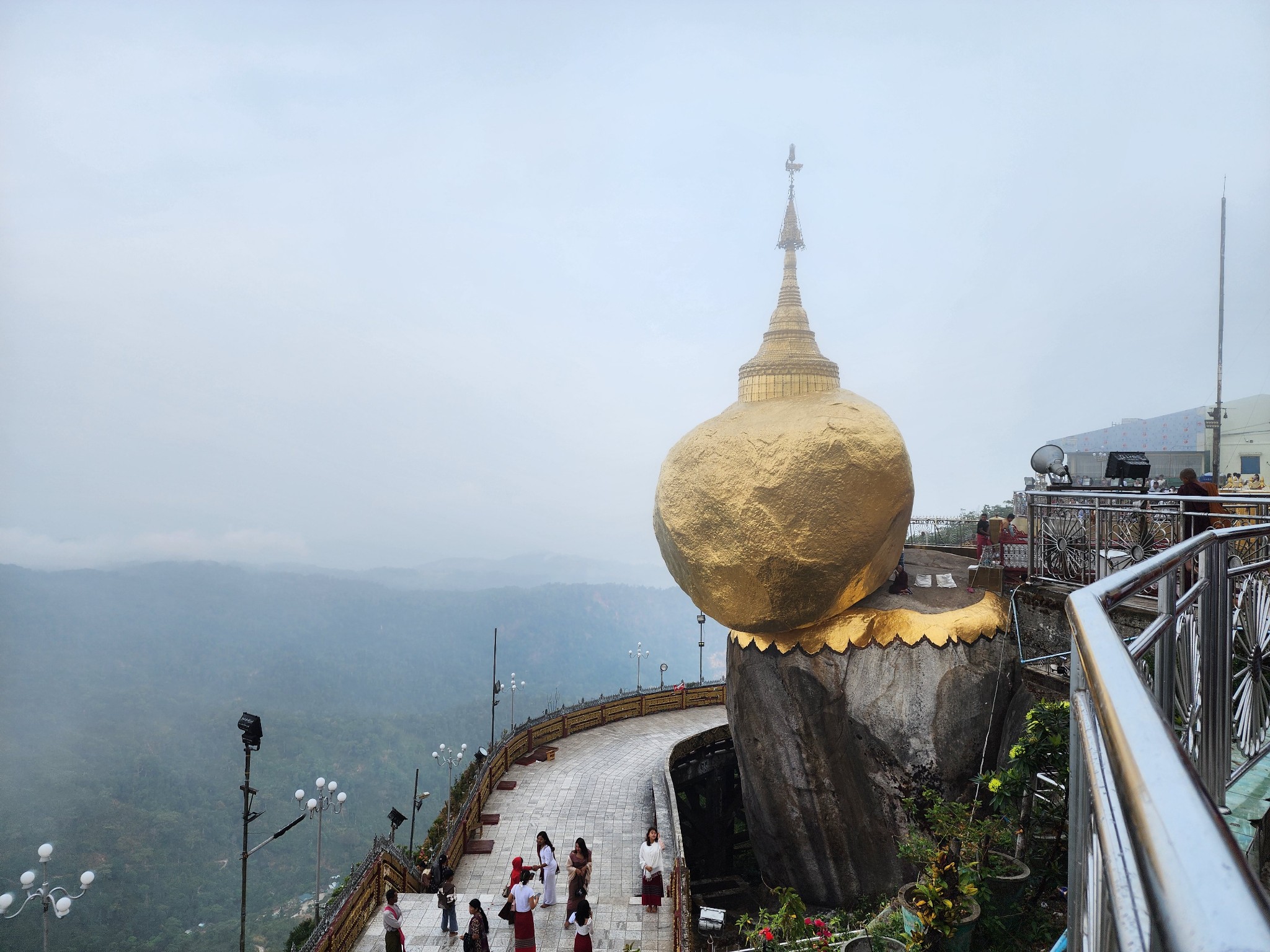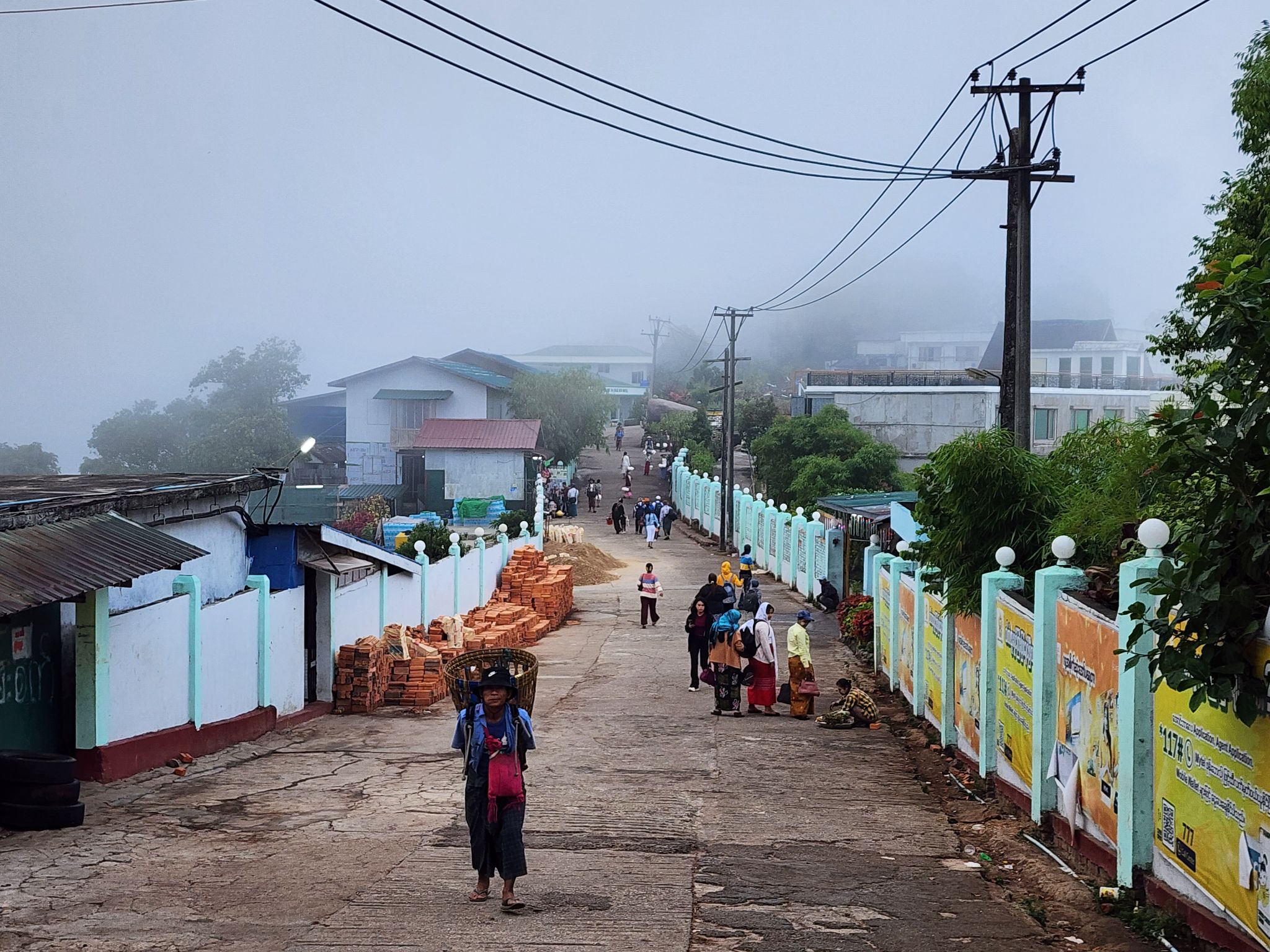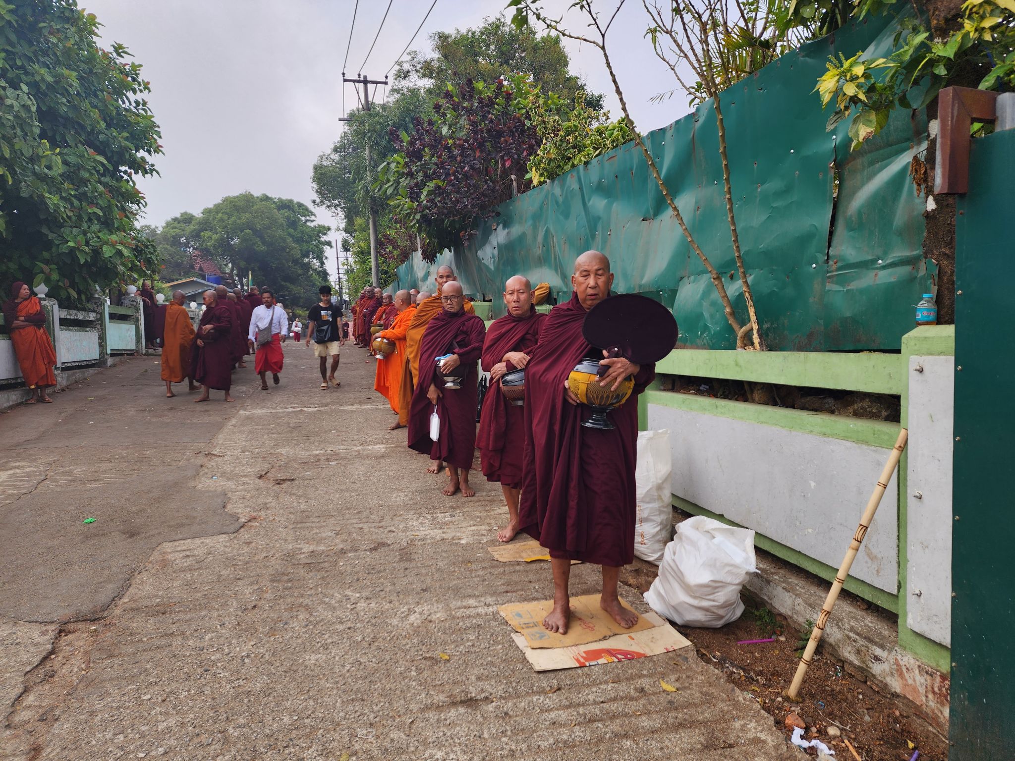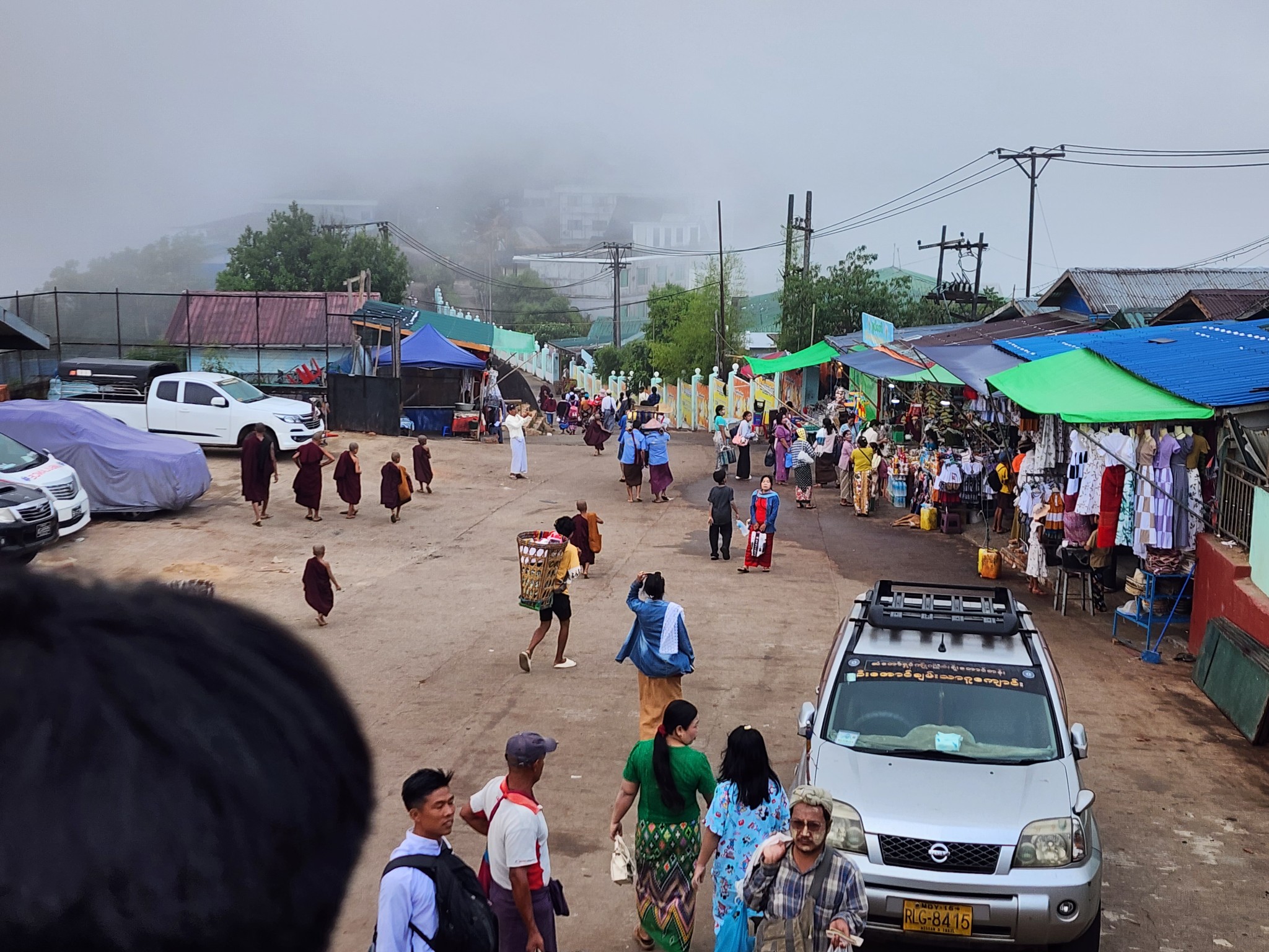 หลังจากรับประทานอาหารเช้าเรียบร้อย ก็ได้เวลาเช็คเอาท์ลงจากเขาครับ แต่ก่อนจะไปก็ขอทำบุญตักบาตรกันก่อน บนนี้ พระสงฑ์จะไม่เดินบิณฑบาตครับ พวกเราญาติโยมนี่แหละจะเดินนำไปถวาย และหาไม่ยากครับ แค่ยืนอยู่แถว ๆ นั้น เหล่าพ่อค้าแม่ขาย ก็ถือถุงกล่องข้าวมาบอกเราว่า "ตักบาตรมั้ย ๆ ยี่สิบบาท" ด้วยระบบเสียงภาษาไทย ไม่ต้องกังวลครับ ทั้งนี้โดยส่วนใหญ่ที่นี่จะใช้เงินจ๊าดเป็นหลัก ตามสถานที่ท่องเที่ยวอาจมีรับเงินบาทบ้าง แต่ไม่อยากให้เคลิ้มกับตัวเลขราคาเพราะหากจ่ายเป็นเงินจ๊าดถูกกว่ามากครับ เช่นชุดตักบาตร 20 นี้ จ่ายเป็นจ๊าดจะประมาณ 16 บาทเท่านั้นครับ