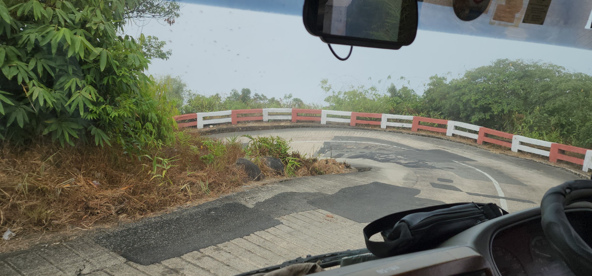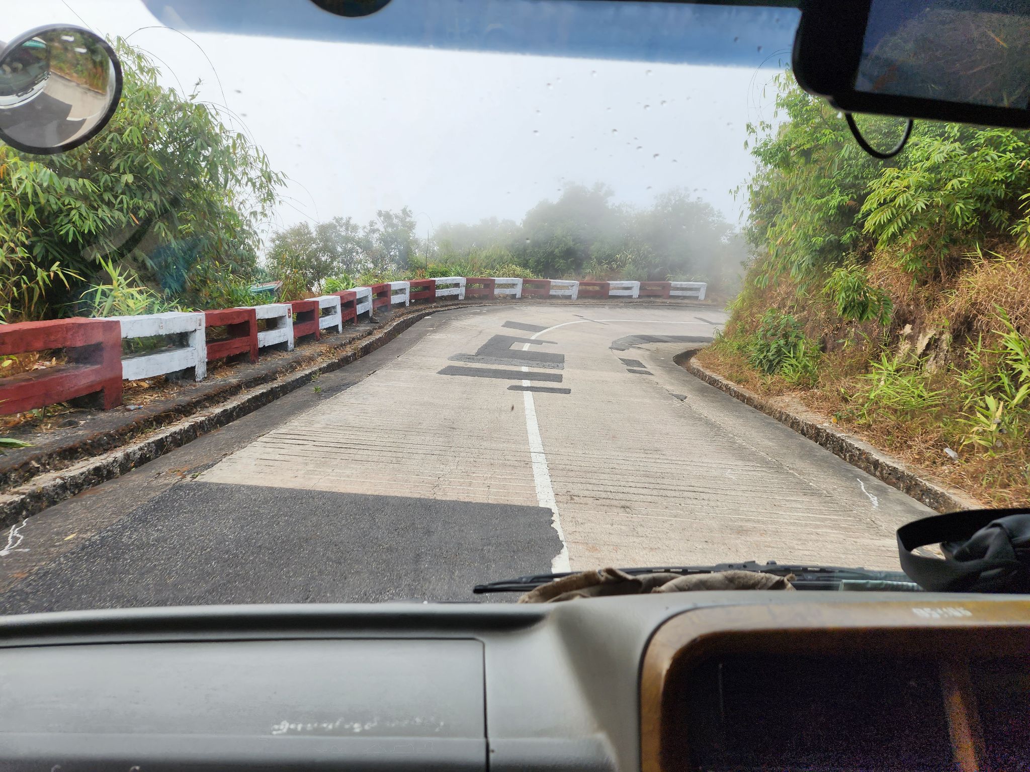 เมื่อวาน ขาขึ้น คิดไว้ในใจอยู่ครับตอนขึ้นยังมันขนาดนี้ ตอนลงจะขนาดได้ ปรากฎว่าโชคดีครับ ได้นั่งหน้าเป็นกำลังใจให้คนขับ และได้เก็บภาพบรรยากาศแบบหวาดเสียวมาให้ดูกันไปเลย ทางลงค่อนข้างชันและเลี้ยวหักศอกเยอะมากครับ แถมมีหมอกหนาให้มองไม่เห็นข้างล่างเพิ่มบรรยากาศความลีกลับขึ้นไปอีก
