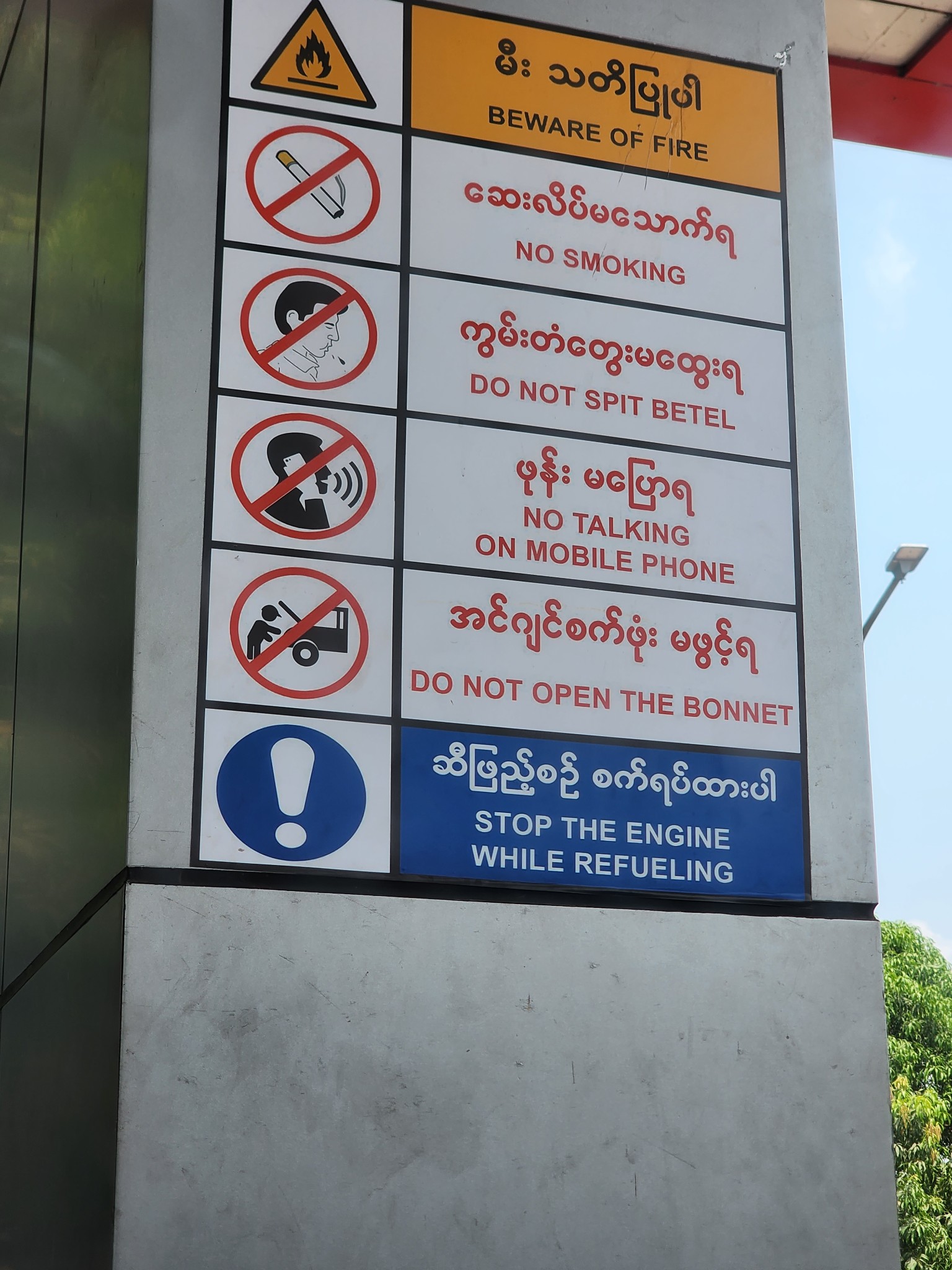 ป้ายคำเตือนข้อปฏิบัติภายในปั้มน้ำมันตามเดิม เพิ่มเติมคือห้ามบ้วนน้ำหมากในเขตปั้มน้ำมันครับ