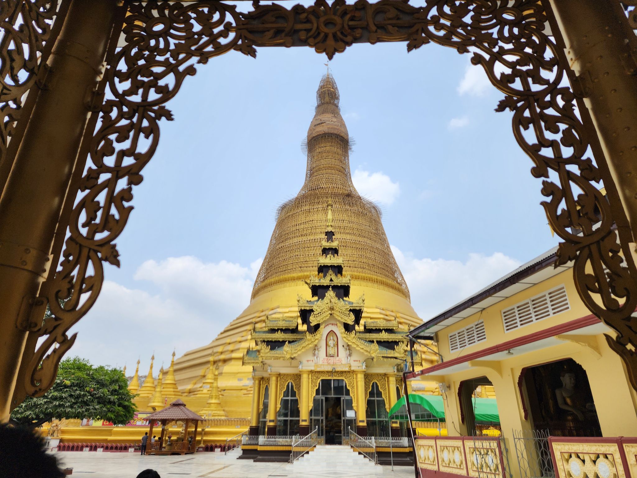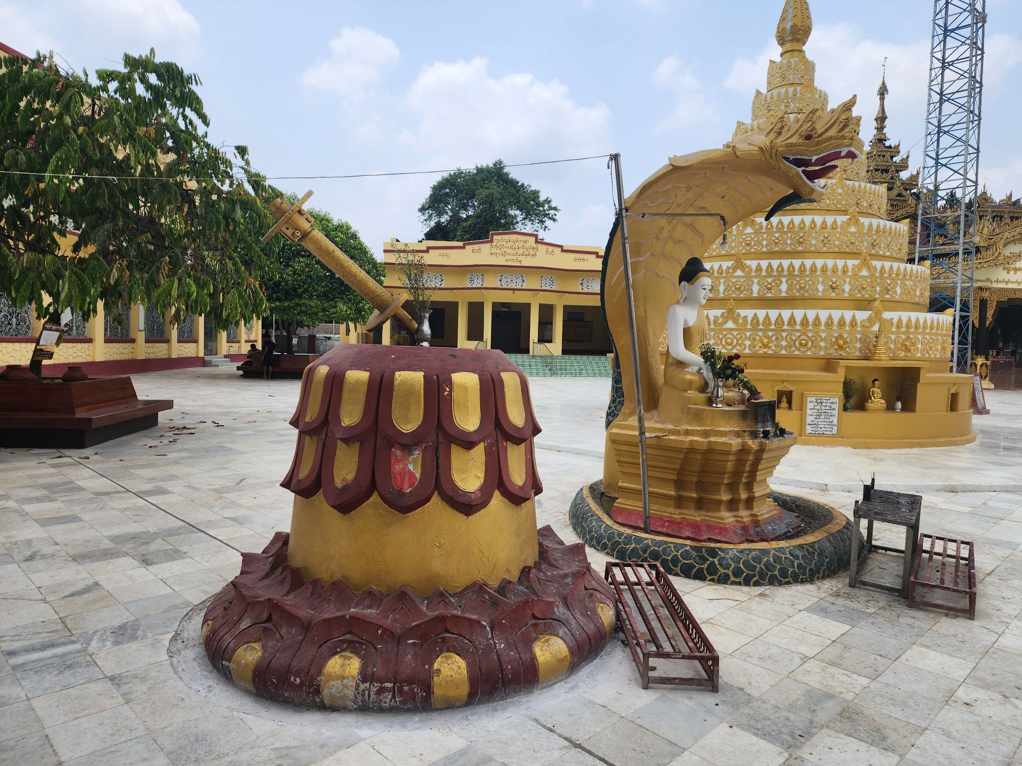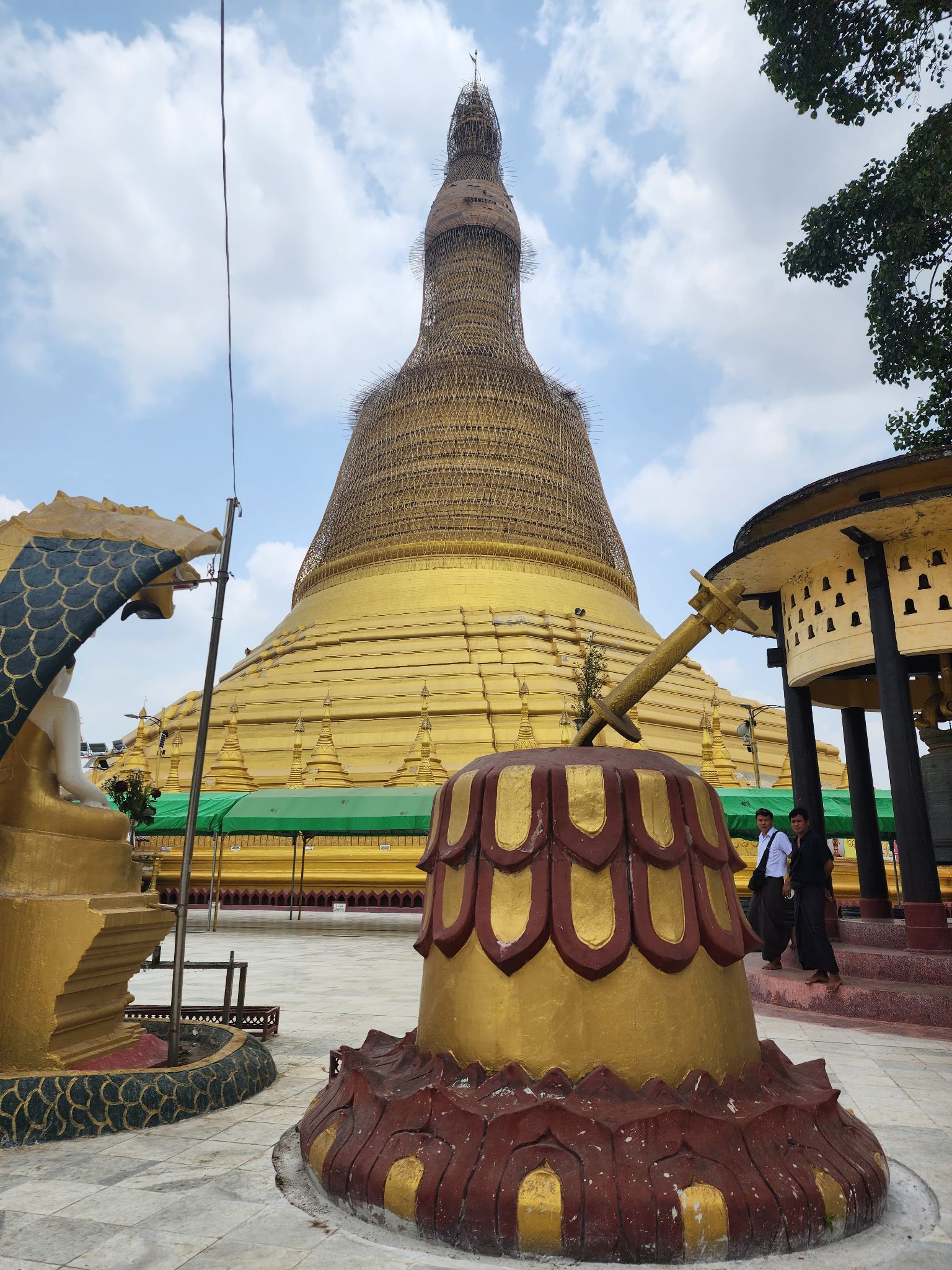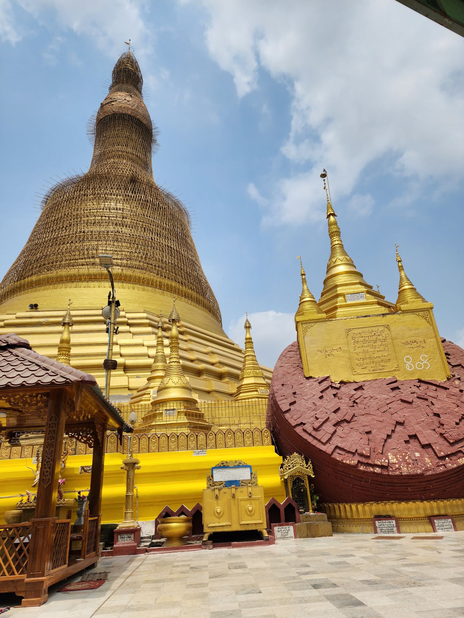องค์เจดีย์สูงใหญ่มากครับ ในการสักการะ ไกด์จะพาไปแตะเพื่ออฐิษฐานจากองค์เจดีย์สีน้ำตาลทางขวาของภาพก่อน เป็นยอดเดิมของเจดีย์ที่พักลงมาเพราะแผ่นดินไหวครับ จึงเชื่อกันว่ามีความศักดิ์สิทธิ์มาก และตามธรรมเนียมของที่นี่ จะขอพรเพียงหนึ่งอย่างครับ จะเป็นความรัก การงาน การเงิน สุขภาพ เลือกอย่างนึง ไกด์จะช่วยสวดให้กับเราเป็นภาษาพม่า โดยอธิบายว่า บทสวดที่นี่จะเขียนเป็นภาษาบาลี แต่สวดเป็นภาษาพม่าครับ