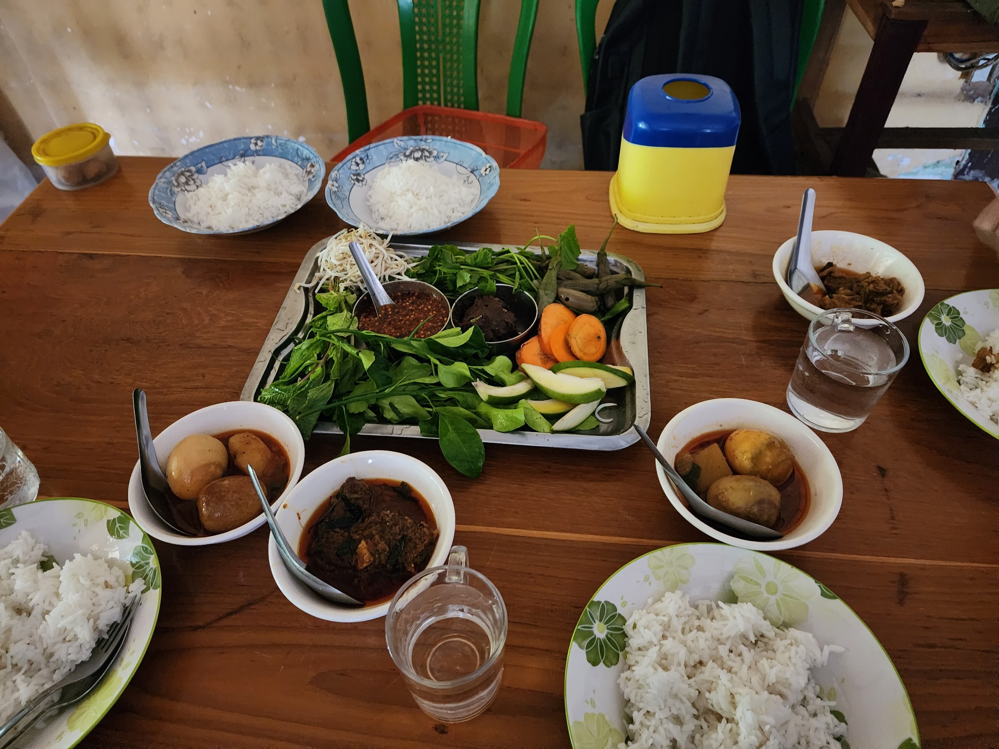ได้เวลาเที่ยงพอดี จึงขอตระเวนหาร้านอาหารแบบชาวพม่า ยังคงเป็นข้าวแกงเหมือนเดิม และเริ่มคุ้นเคยกับระบบการสั่งแล้วครับ เลือกแกง ได้ข้าว ผัก น้ำพริก ซุป ชา เหมือนเดิม เพิ่มเติมคือ มื้อนี้กินแบบมืด ๆ หน่อย เพราะได้โต๊ะในอาคารและไฟดับครับ
