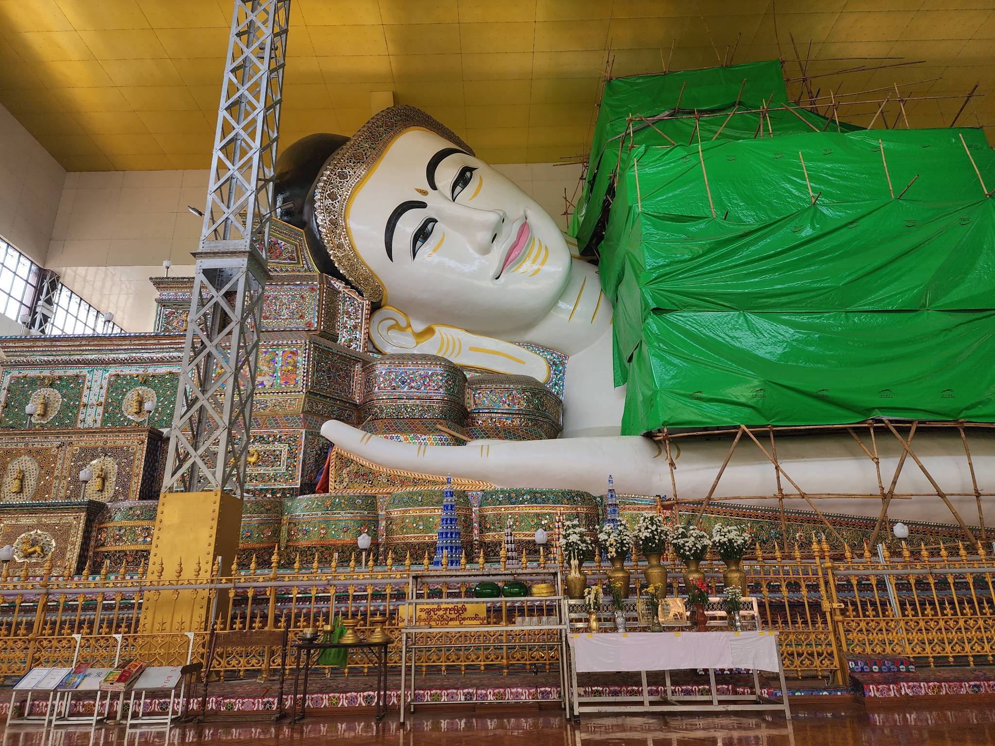 หลังทานข้าวเสร็จ พวกเราก็ไปกันต่อที่ พระนอนชเวตาลยอง (Shwethalyaung Buddha) อีกหนึ่งหมุดหมายของการมาเยือนเมืองพะโคแห่งนี้ครับ โดยเป็นพระพุทธรูปไสยาสน์ ที่เชื่อว่าสร้างขึ้นตั้งแต่ ศตวรรษที่ 9 โดยเอกลักษณ์ขององค์พระคือ พระบาท หรือ เท้าขององค์พระ จะมีการเว้นระดับ ไม่เรียงชิดติดกัน (นึกภาพแบบพระนอนวัดโพธิ์) เพราะเชื่อว่า เป็นการแสดงถึงพระพุทธเจ้าในคืนก่อนดับขับปรินิพพาน จึงยังมีอิริยาท่าทางต่าง ๆ น่าเสียดาย วันที่ผมมา มีการบูรณะ จึงอาจเก็บรรยากาศได้ไม่ทั่วถึงนัก