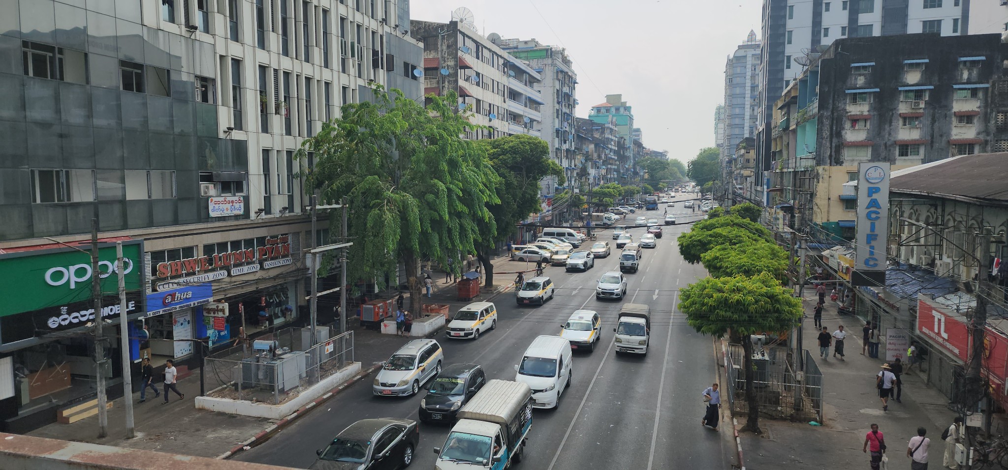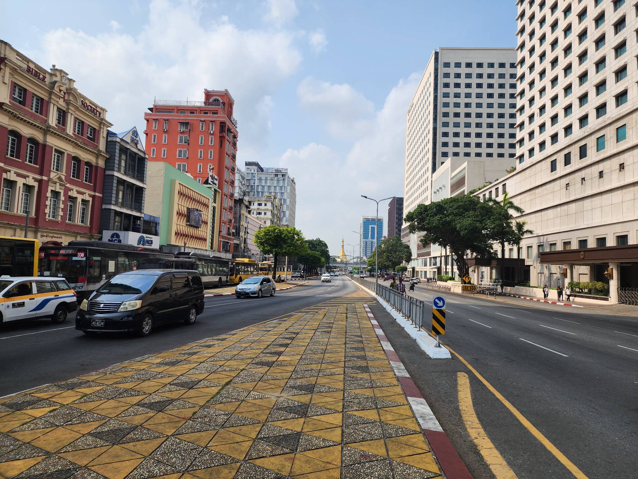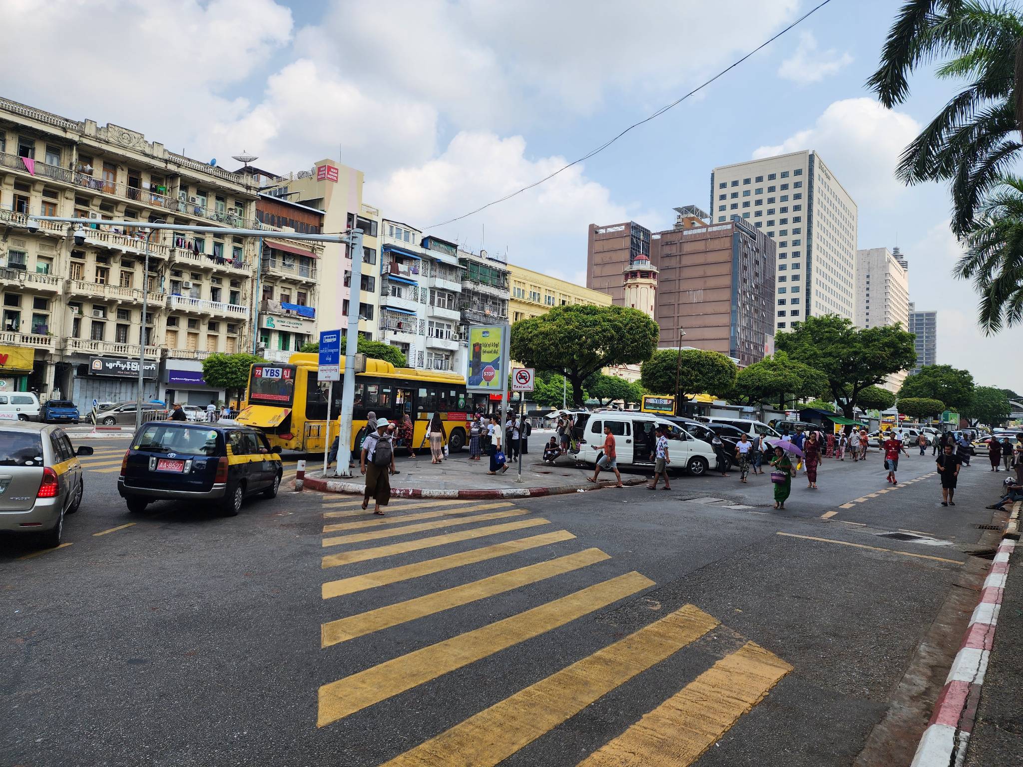 บริเวณสี่แยก ศูนย์กลางการต่อรถเมล์ของที่นี่ มองไปไกลลิบ คือ เจดีย์ชูเล่ เป็นเจดีย์ที่ตั้งอยู่กลางวงเวียน
