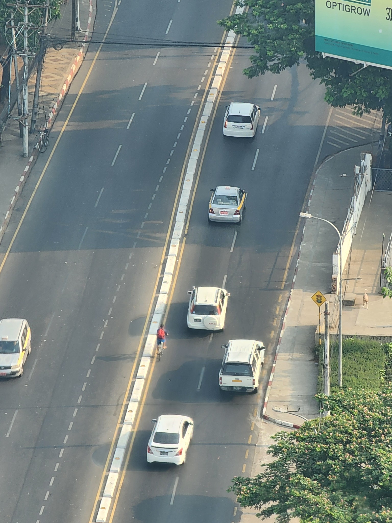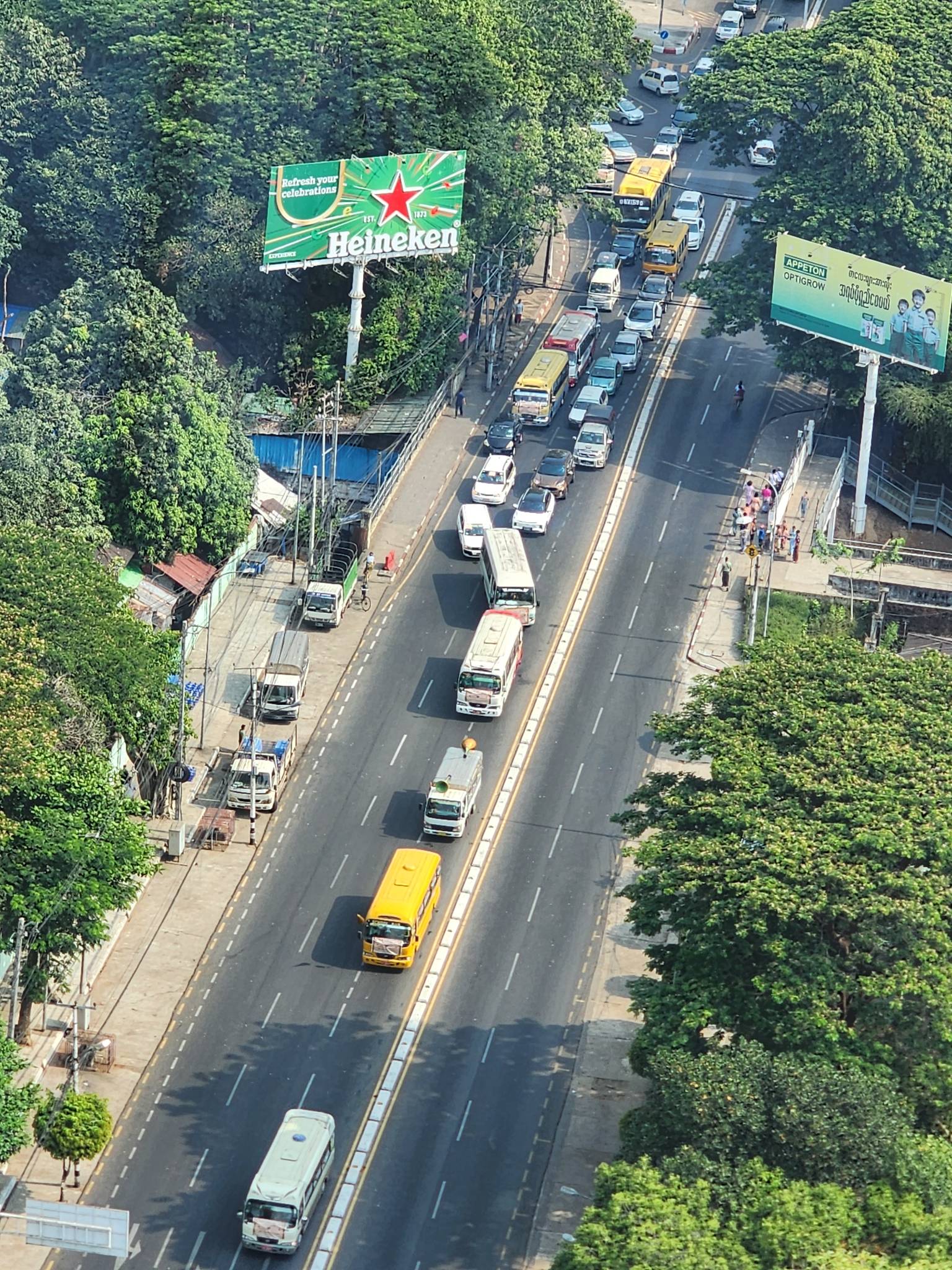 เริ่มต้นภาพแรกด้วยท้องถนนเมืองย่างกุ้งในเช้าเสาร์ครับ อย่างที่ทราบกันว่าในย่างกุ้ง ห้ามใช้จักรยานยนต์ คนที่นี่ถ้าไม่ใช้รถยนต์ก็ต้องใช้จักรยานแทนครับ เชื่อว่ามีการบังคับใช้เข้มงวดพอสมควร เนื่องจากไรเดอร์ส่งอาหารของที่นี่ (ย่างกุ้งมีแอพเรียกแท็กซี่ มีแอพสั่งอาหารนะครับ) ต้องส่งออเดอร์ด้วยการปั่นจักรยานครับ