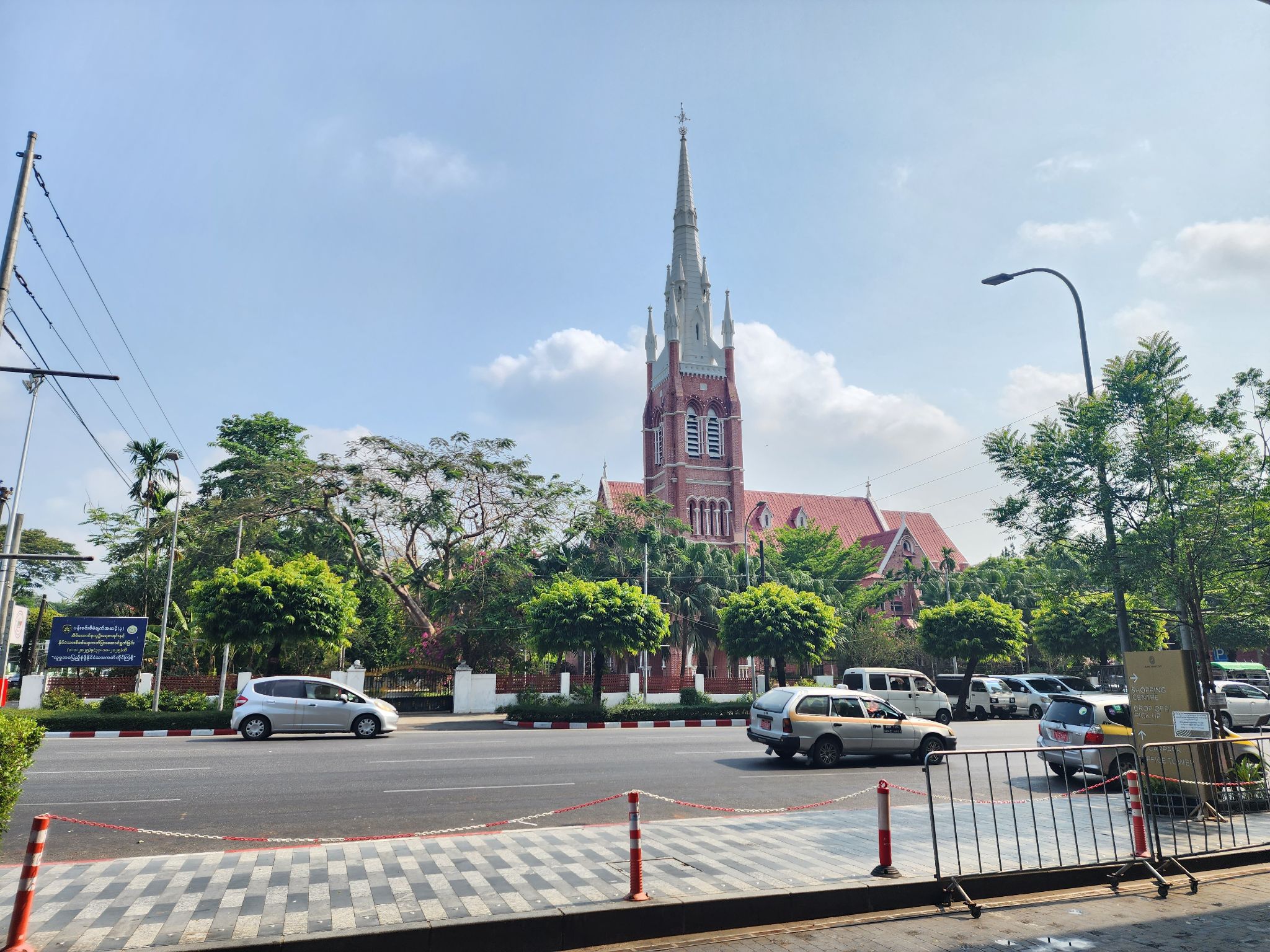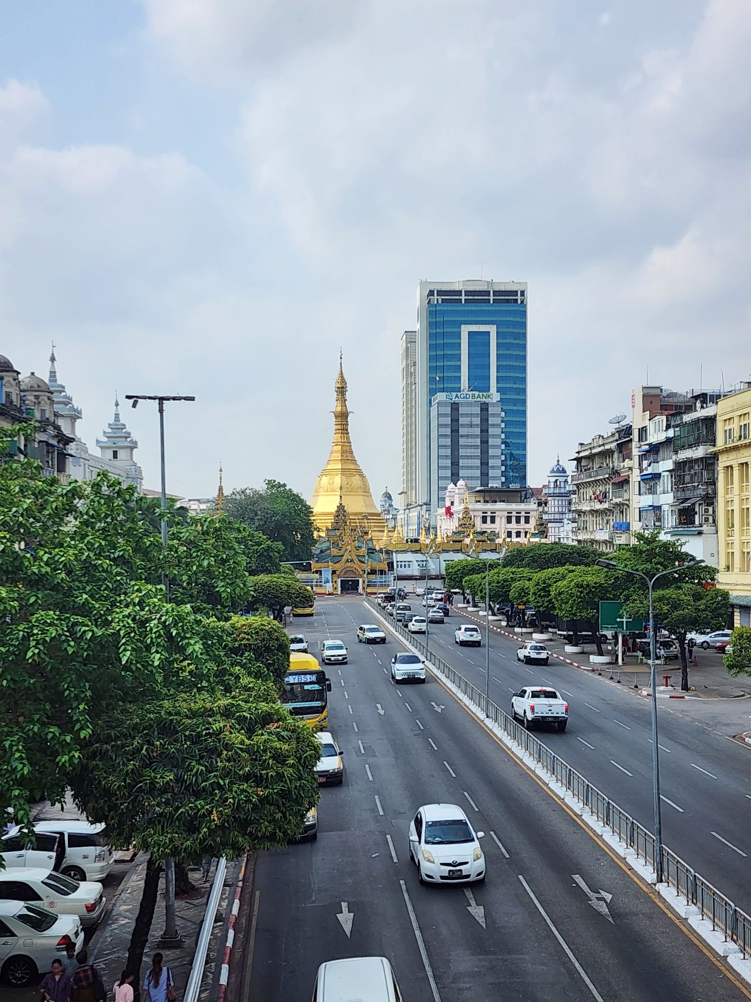 มองจากที่นี่จะเห็น เจดีย์ชูเล่ อาคารศาลากลาง และโบสถ์ เรียงกันอย่างสวยงาม