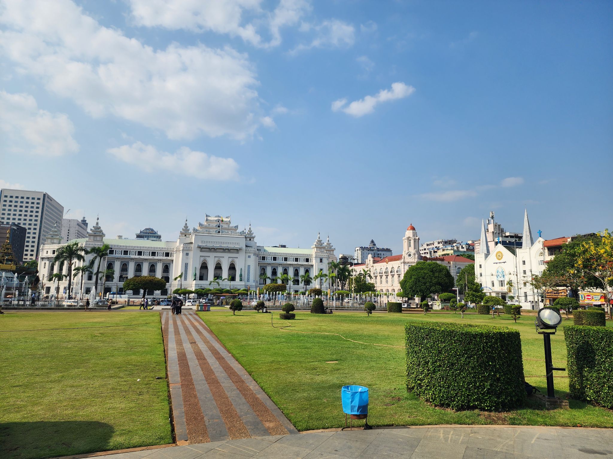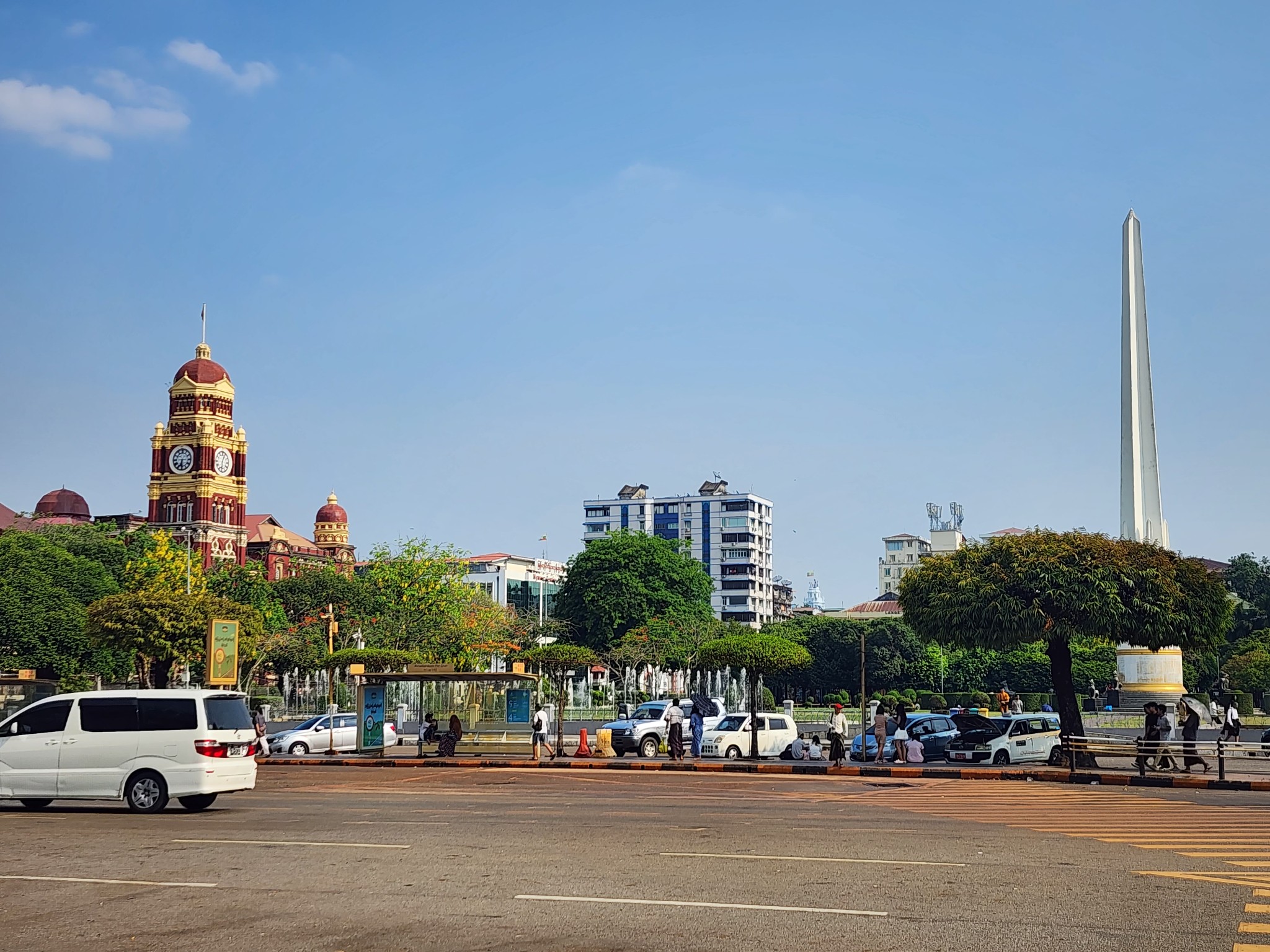 ข้าง ๆ อาคาร High court จะเป็นอนุเสาวรีย์เสาโอเบลิก Maha Bandula Park ครับ เป็นพื้นที่สาธารณะที่จัดวางผังเมืองได้อย่างสวยงามมาก หากยืนในสวนแห่งนี้ เราจะเห็น อาคาร High court, โบสถ์, Yangon City Hall, และเจดีย์ชูเล่ อยู่ล้อมรอบครับผม